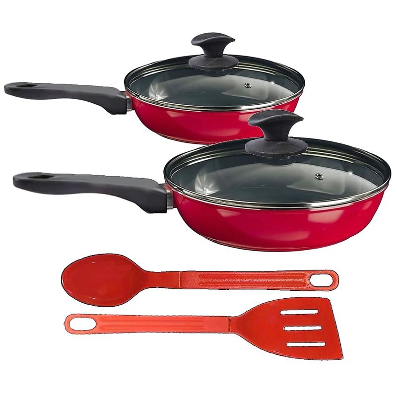 Jogo Frigideiras Antiaderente Cerâmica Javali 16e24 T03 N06 As frigideiras antiaderente é fabricada com outros materiais e ganham uma cobertura em cerâmica, garantindo assim um revestimento atóxico e antiaderente, capaz de repelir certas substâncias. Por isso, a comida não gruda nela. É resistente a altas temperaturas e a arranhões. As frigideiras em cerâmica antiaderente contam com uma camada que cobre o seu material e evita que o alimento grude em seu interior. Dessa forma, contribuem para uma culinária saudável, dispensando o uso excessivo de gordura ou óleos vegetais. Para quem gosta de um peixe ou filé de frango grelhado, ou não dispensa uma omelete deliciosa, não pode deixar de ter uma em sua cozinha. Manutenção e Dicas: 1. Não use metal na sua frigideira em cerâmica.2. Evite grandes mudanças de temperatura. (Levar uma panela quente para a água fria pode fazer com que a panela deforme.)3. Limpe suas frigideira com esponjas que não causem riscos.4. Não é ideal para máquina lava louças.5. Evite altas temperaturas de cozimento.6. Não deixe a panela vazia no fogo. Especificações Técnicas 16cm:Revestimento Interno: Antiaderente em Cerâmica cor Cinza.Revestimento Externo: Alumínio Fundido Vermelho.Segue com Cabo de Baquelite e Tampa de Vidro.Litragem: 0,550ml.Largura: 16cm.Peso: 0,400g.Altura: 5cm. Especificações Técnicas 24cm:Revestimento Interno: Antiaderente em Cerâmica cor Cinza.Revestimento Externo: Alumínio Fundido Vermelho.Segue com Cabo de Baquelite e Tampa de Vidro.Litragem: 1,750ml.Largura: 24cm.Peso: 1,300Kg.Altura: 7cm. Especificações Técnicas Talheres:Modelos: Colher de Arroz e Espátula.Medidas: 28cm (Todos os modelos).Material: Nylon.Cor: Vermelho. Itens Inclusos:01 Frigideira Antiaderente Cerâmica Javali Vermelho 16cm .01 Frigideira Antiaderente Cerâmica Javali Vermelho 24cm. 02 Talheres em Nylon Antiaderente Vermelho. Código: 518e520eT03JAV ProdutoLojaPlast.