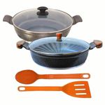 Jogo Frigideiras Antiaderente em Cerâmica AAeAM 30cm T05 N10 A panela antiaderente é fabricada com outros materiais e ganham uma cobertura em cerâmica, garantindo assim um revestimento atóxico e antiaderente, capaz de repelir certas substâncias. Por isso, a comida não gruda nela. É resistente a altas temperaturas e a arranhões. As panelas em cerâmica antiaderente contam com uma camada que cobre o seu material e evita que o alimento grude em seu interior. Dessa forma, contribuem para uma culinária saudável, dispensando o uso excessivo de gordura ou óleos vegetais. Para quem gosta de um peixe ou filé de frango grelhado, ou não dispensa uma omelete delicioso, não pode deixar de ter uma em sua cozinha. Manutenção e Dicas:1. Não use metal na sua panela de cerâmica.2. Evite grandes mudanças de temperatura. (Levar uma panela quente para a água fria pode fazer com que a panela deforme.)3. Limpe suas frigideiras com esponjas que não causem riscos.4. Não é ideal para máquina lava louças.5. Evite altas temperaturas de cozimento.6. Não deixe a panela vazia no fogo. Especificações Técnicas 30cm:Revestimento Interno: Antiaderente em Cerâmica cor Cinza.Revestimento Externo: Alumínio Fundido Preto Craqueado.Segue com alça de Alumínio e Tampa de Vidro.Diâmetro: 30cm.Peso: 2,05kg.Altura: 9cm. Especificações Técnicas 30cm:Revestimento Interno: Antiaderente em Cerâmica cor Cinza.Revestimento Externo: Alumínio Fundido Preto Craqueado.Segue com alça de Madeira e Tampa de Vidro.Diâmetro: 30cm.Peso: 2,05kg.Altura: 9cm. Especificações Técnicas Talheres:Modelos: Colher de Arroz e Espátula.Medidas: 28cm (Todos os modelos).Material: Nylon.Cor: Laranja. Itens Inclusos:01 Frigideira Antiaderente em Cerâmica Javali Preto Craqueado Alça de Alumínio 30cm .01 Frigideira Antiaderente em Cerâmica Javali Preto Craqueado Alça de Madeira 30cm.02 Talheres em Nylon Antiaderente Laranja. Código: 1641e1872eT05JAV ProdutoLojaPlast.