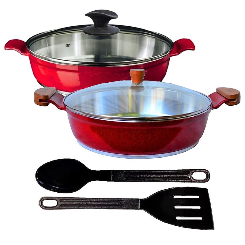 Jogo Frigideiras Antiaderente Usinado AA e AM 30cm T02 N12 A linha de frigideiras usinadas se destacam pelo brilho interno das peças, resultante do processo da fabricação de alta qualidade. As frigideiras usinadas são fabricadas em alumínio fundido. Esse material é muito popular por oferecer um excelente custo benefício e por permitir um design versátil e prático, são muito procuradas pois possuem um preço competitivo e tem maior durabilidade. Faça seus alimentos mais saudáveis e saborosos com nossas frigideiras usinadas. Especificações Técnicas 30cm:Revestimento Externo: Alumínio Fundido Vermelho.Revestimento Interno: Diamantado/Usinado.Segue com alça de Alumínio e Tampa de Vidro.Diâmetro: 30cm.Peso: 2,05kg.Altura: 9cm. Especificações Técnicas 30cm:Revestimento Externo: Alumínio Fundido Vermelho.Revestimento Interno: Diamantado/Usinado.Segue com alça de Madeira e Tampa de Vidro.Diâmetro: 30cm.Peso: 2,05kg.Altura: 9cm. Especificações Técnicas Talheres:Modelos: Colher de Arroz e Espátula.Medidas: 28cm (Todos os modelos).Material: Nylon.Cor: Preto. Itens Inclusos:01 Frigideira Antiaderente Usinado Javali Vermelho Alça de Alumínio 30cm .01 Frigideira Antiaderente Usinado Javali Vermelho Alça de Madeira 30cm.02 Talheres em Nylon Antiaderente Preto. Código: 265e267eT02JAV ProdutoLojaPlast.