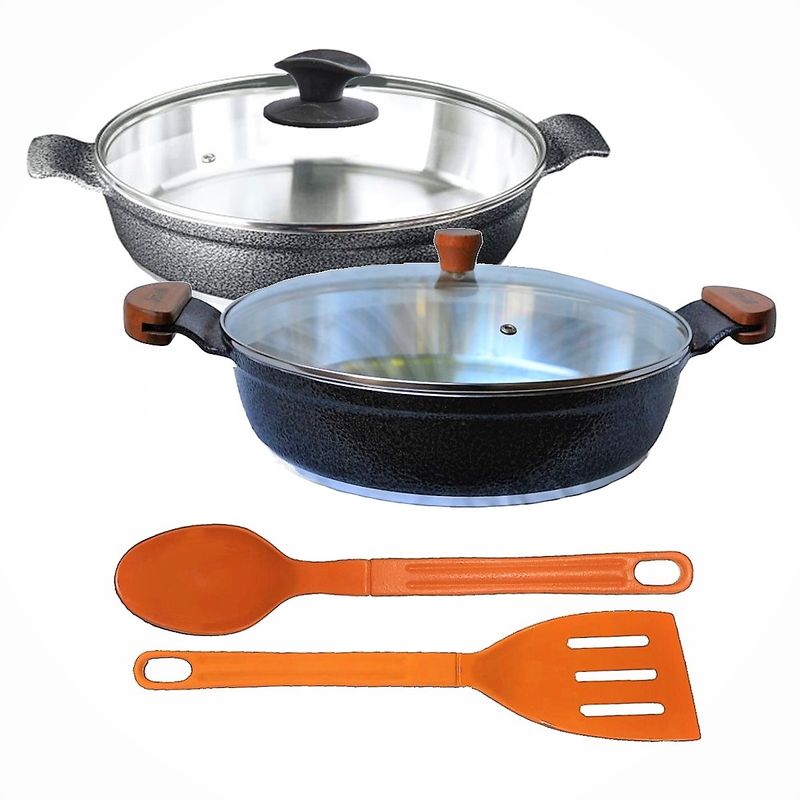 Jogo Frigideiras Antiaderente Usinado AA e AM 30cm T05 N10 A linha de frigideiras usinadas se destacam pelo brilho interno das peças, resultante do processo da fabricação de alta qualidade. As frigideiras usinadas são fabricadas em alumínio fundido. Esse material é muito popular por oferecer um excelente custo benefício e por permitir um design versátil e prático, são muito procuradas pois possuem um preço competitivo e tem maior durabilidade. Faça seus alimentos mais saudáveis e saborosos com nossas frigideiras usinadas. Especificações Técnicas 30cm:Revestimento Externo: Alumínio Fundido Preto Craqueado.Revestimento Interno: Diamantado/Usinado.Segue com alça de Alumínio e Tampa de Vidro.Diâmetro: 30cm.Peso: 2,05kg.Altura: 9cm. Especificações Técnicas 30cm:Revestimento Externo: Alumínio Fundido Preto Craqueado.Revestimento Interno: Diamantado/Usinado.Segue com alça de Madeira e Tampa de Vidro.Diâmetro: 30cm.Peso: 2,05kg.Altura: 9cm. Especificações Técnicas Talheres:Modelos: Colher de Arroz e Espátula.Medidas: 28cm (Todos os modelos).Material: Nylon.Cor: Laranja. Itens Inclusos:01 Frigideira Antiaderente Usinado Javali Preto Craqueado Alça de Alumínio 30cm .01 Frigideira Antiaderente Usinado Javali Preto Craqueado Alça de Madeira 30cm. 02 Talheres em Nylon Antiaderente Laranja. Código: 770e591eT05JAV ProdutoLojaPlast.