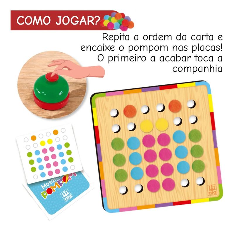 Aviso: Imagens meramente ilustrativas!! A criança vai desenvolver a coordenação motora fina, concentração e memória com essa atividade inspirada no método Montessori. Cada criança recebe uma placa de madeira e deverá repetir a ordem dos pompons de acordo com a carta sorteada. Cada pompom é colocado com uma pinça. O primeiro a terminar, toca a campainha. Contém: 2 Placas de madeira (21 x 21 cm), 2 Pinças plásticas, 30 cartas - figuras, 1 campainha, 112 pompons e 1 Instrução Idade: 3+ Anos Material: Madeira MDF, polipropileno, bolinhas em poliéster e caixa em papel Marca: Nig Brinquedos