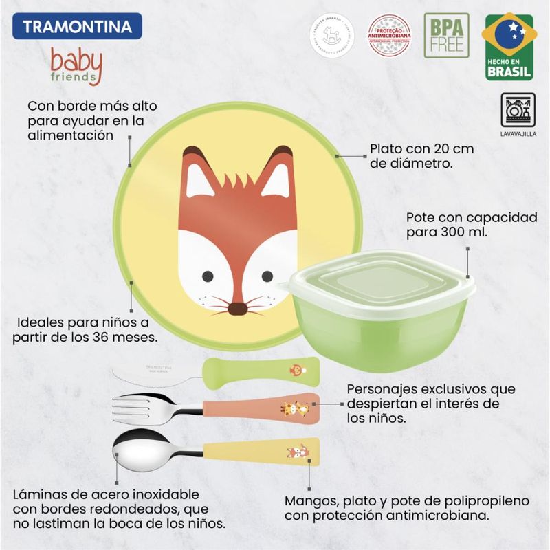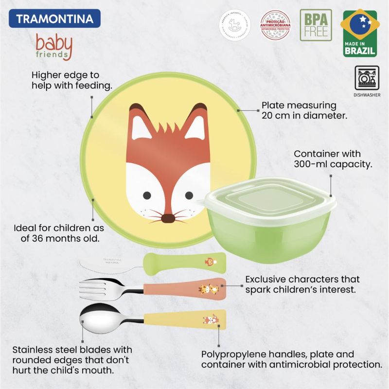 Jogo Infantil Tramontina Baby Friends Colorido 05 Peças Para levar alegria e diversão para a mesa dos pequenos, o jogo infantil Tramontina Baby Friends colorido 05 peças é o ajudante perfeito. Com peças com lâminas em aço inox e cabos de polipropileno colorido, ele vai garantir refeições cheias de autonomia e com muito qualidade, pois são muito resistentes. Seu prato é em polipropileno e conta com borda alta que auxilia com que a comida fique no prato, evitando sujeira e desperdícios. Escolha Tramontina e transforme a refeição dos seus filhos! Lâminas de aço inox com bordas arredondadas que não machucam a boca da criança.Os cabos, pote e prato de polipropileno possuem maior resistência e durabilidade.Prato com borda mais alta para auxiliar a alimentação, evitando que a comida saia do prato. Produtos com proteção antimicrobiana que inibem o crescimento de fungos e bactérias, proporcionando benefícios em higiene e redução de microorganismos que causam contaminação.Podem ir a máquina de lavar louças, facitando a limpeza. Produtos Livre de BPA: O Bisfenol-A é um componente químico usado na produção de alguns plásticos como o Policarbonato. Este componente pode ser prejudicial à saúde e por isso a Tramontina não o utiliza em seus produtos.