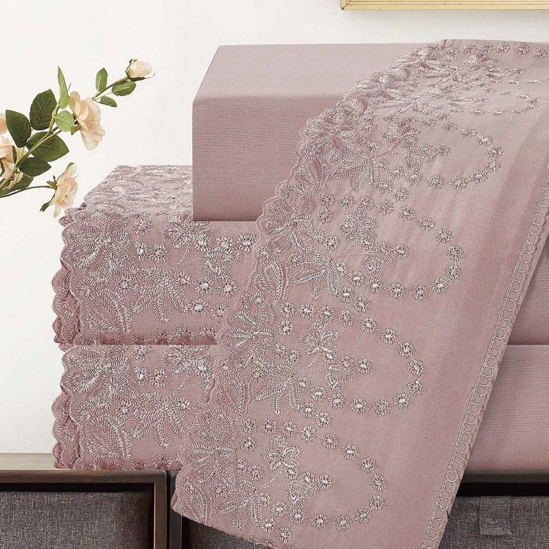 Jogo Lençol Casal Jade Bordado Inglês 4pç 100% Poliéster - MalvO Jogo de lençol para cama Casal Padrão com 04 peças confeccionado em tecido Percal 300 fios, detalhes em bordado inglês na fronha e no lençol de cima. Possui alto padrão de qualidade, proporciona conforto e sofisticação.Contém na embalagem:01 Lençol superior Comp (2,50m) x Larg (2,25m)01 Lençol de baixo com elástico (2,50m) x (2,25m) para colchão de (1,88m)x(1,38cm)x(30cm)02 Fronhas Comp (70cm) x Larg (50cm)*Observações: Considere as medidas e formatos especificados na descrição do produto.* DECORAÇÃO LUXUOSA DE ALTO PADRÃOComposição: 100% Poliéster*As fotos são meramente ilustrativas.*As cores podem variar de acordo com cada monitor e não representam todas as peças que compõem a descrição do produto.*Fique atento à descrição do produto.