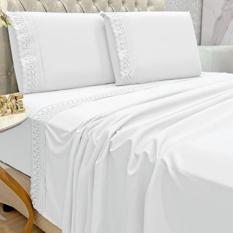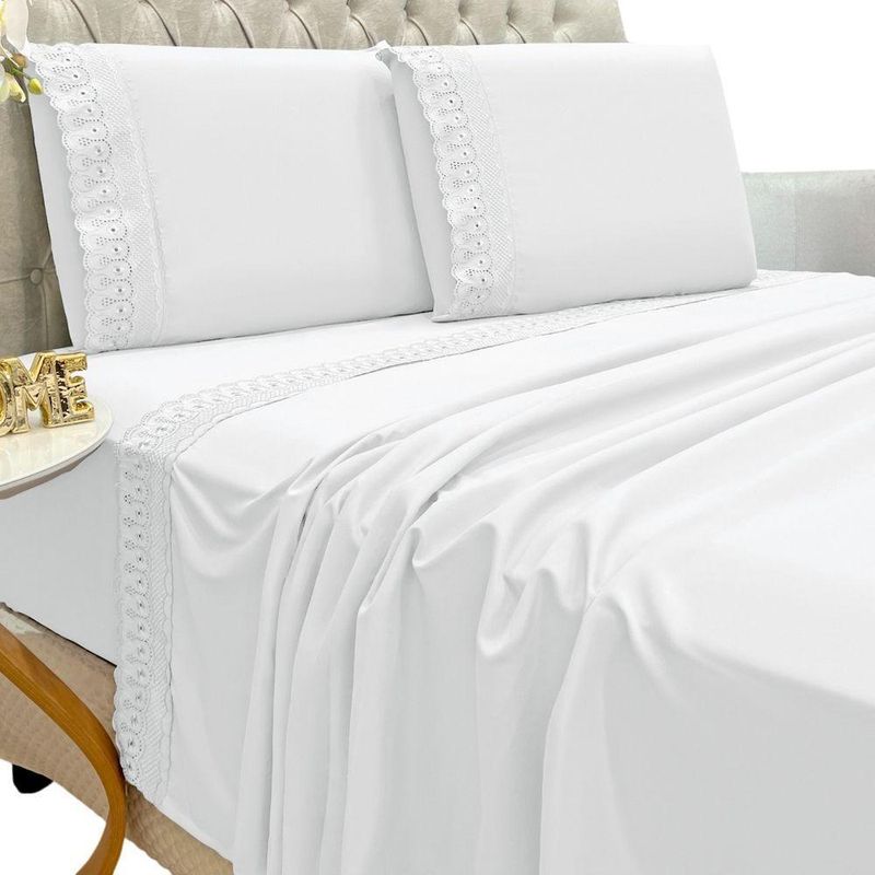 Jogo Lençol Queen Grace Bordado 4pç 100% Poliéster - BrancoO Jogo de lençol para cama Queen com 04 peças confeccionado em tecido Percal 300 fios, detalhes bordado na fronha e no lençol de cima. Possui alto padrão de qualidade, proporciona conforto e sofisticação.Contém na embalagem:01 Lençol superior Comp (2,50m) x Larg (2,40m)01 Lençol de baixo com elástico (2,50m) x (2,40m) para colchão de (1,98m)x(1,58cm)x(38cm)02 Fronhas Comp (70cm) x Larg (50cm)*Observações: Considere as medidas e formatos especificados na descrição do produto.* DECORAÇÃO LUXUOSA DE ALTO PADRÃOComposição: 100% Poliéster*As fotos são meramente ilustrativas.*As cores podem variar de acordo com cada monitor e não representam todas as peças que compõem a descrição do produto.*Fique atento à descrição do produto.