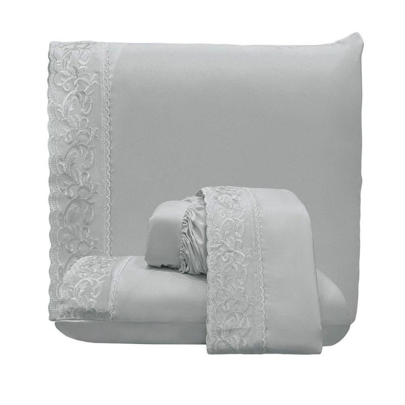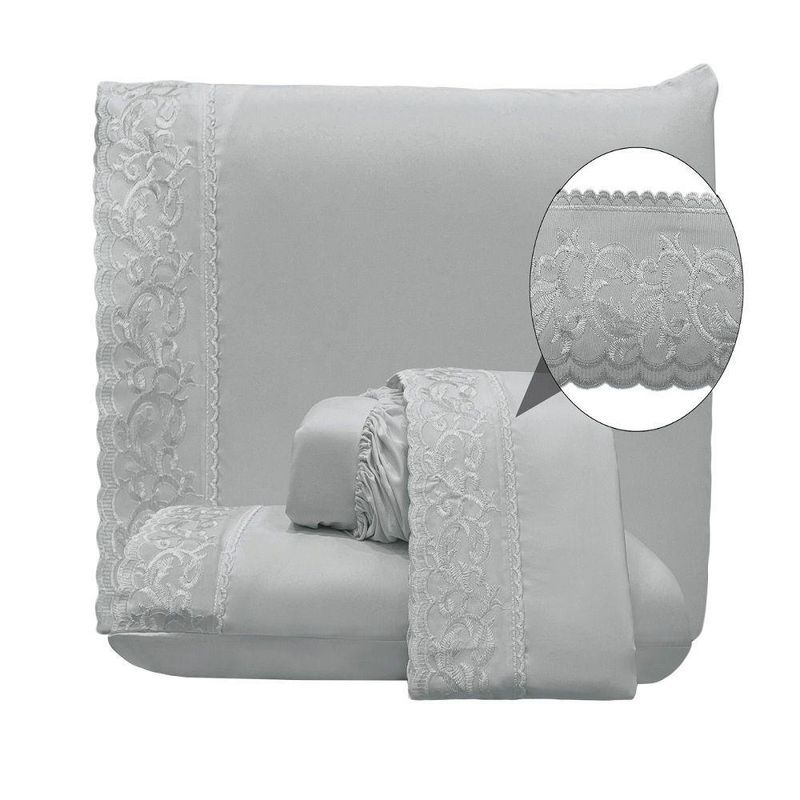 Jogo Lençol Queen Nuance Bordado Inglês 4pç 100% Poliéster - CinzaO Jogo de lençol para cama Queen com 04 peças confeccionado em tecido Percal 300 fios, detalhes em bordado inglês na fronha e no lençol de cima. Possui alto padrão de qualidade, proporciona conforto e sofisticação.Contém na embalagem:01 Lençol superior Comp (2,50m) x Larg (2,40m)01 Lençol de baixo com elástico (2,50m) x (2,40m) para colchão de (1,98m)x(1,58cm)x(38cm)02 Fronhas Comp (70cm) x Larg (50cm)*Observações: Considere as medidas e formatos especificados na descrição do produto.* DECORAÇÃO LUXUOSA DE ALTO PADRÃOComposição: 100% Poliéster*As fotos são meramente ilustrativas.*As cores podem variar de acordo com cada monitor e não representam todas as peças que compõem a descrição do produto.*Fique atento à descrição do produto.