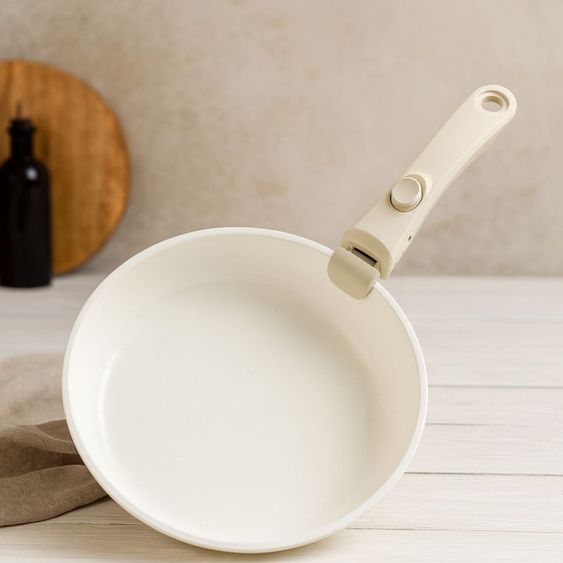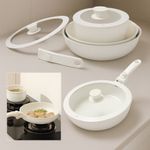 Jogo Panelas Cerâmica Antiaderente Com Cabo RemovívelA panela de cerâmica antiaderente é ideal para quem busca praticidade e saúde no dia a dia. Com revestimento cerâmico premium, permite cozinhar com menos óleo sem que os alimentos grudem, além de facilitar a limpeza.CaracterísticasMaterial premium: Fabricado em cerâmica com revestimento antiaderente de alta qualidade, livre de PFOA e PTFE.Design moderno: Cor branca elegante com detalhes em madeira e silicone, ideal para combinar com qualquer estilo de cozinha.Cabos removíveis: Sistema de encaixe seguro que facilita o armazenamento e a limpeza.Tampa de vidro temperado: Resistente ao calor, com saída de vapor para melhor controle no preparo.Compatibilidade: Funciona em fogões a gás, elétricos, vitrocerâmica e indução (base reforçada).Benefícios:Cozinhar sem óleo: O revestimento antiaderente permite preparar receitas mais saudáveis.Fácil de limpar: Superfície lisa que não gruda, economizando tempo na hora da limpeza.Armazenamento prático: As peças são empilháveis, ocupando menos espaço no armário.Versatilidade na cozinha: Ideal para fritar, refogar, assar e até servir diretamente à mesa.Durabilidade: Estrutura reforçada, garantindo maior vida útil ao produto.O que contém na caixa:1 Panela 18cm1 Panela 20cm 1 Frigideira 20cm1 Frigideira 26cm1 Frigideira Funda 26cm 1 Tampa Silicone 20cm 1 Tampa Silicone 26cm 2 Cabos 1 Tampa Pequena 18cm1 Tampa Pequena 20cm3 Utensílios de silicone4 Descansos de panela em feltro para evitar riscos durante o empilhamentoEste Kit Completo de Panelas em Cerâmica Antiaderente é a escolha perfeita para quem busca praticidade, saúde e elegância na cozinha!