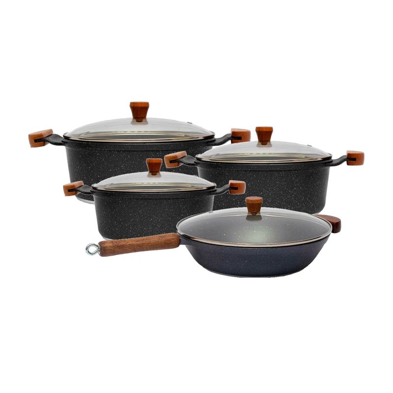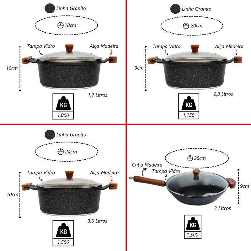 Jogo Panelas Granito AM 18 20 24 e Frigideira 24cm Javali As caçarolas e frigideiras antiaderente, também conhecidas como teflon, são revestidas com uma substância capaz de repelir certas substâncias. Por isso, a comida não gruda nela. É resistente a altas temperaturas e a arranhões. As caçarolas e frigideiras em alumínio antiaderente contam com uma camada que cobre o seu material e evita que o alimento grude em seu interior. Dessa forma, contribuem para uma culinária saudável, dispensando o uso excessivo de gordura ou óleos vegetais. Para quem gosta de um peixe ou filé de frango grelhado, ou não dispensa uma omelete delicioso, não pode deixar de ter uma em sua cozinha. Manutenção e Dicas:1. Evite grandes mudanças de temperatura. (Levar uma frigideira quente para a água fria pode fazer com que a frigideira deforme.)2. Limpe suas frigideiras antiaderentes com esponjas que não causem riscos.3. Use detergentes mais suaves para limpar suas frigideiras antiaderentes.4. Não use metal na sua frigideira antiaderente.5. Não é ideal para máquina lava louças.6. Evite altas temperaturas de cozimento.7. Não deixe a frigideira vazia no fogo. Especificações Técnicas:Revestimento Externo: Antiaderente Marmorizado Granito.Revestimento Interno: Antiaderente Marmorizado Granito.Caçarolas: Alça de Madeira e Tampa de Vidro.Frigideira: Cabo em Baquelite Sem Tampa. Medidas Caçarolas:Litragem: 1,7L.Largura: 18cm.Altura: 10cm.Peso: 1Kg. Litragem: 2,3L.Largura: 20cm.Peso: 1,15Kg.Altura: 9cm Litragem: 3,6L.Largura: 24cm.Peso: 1,550Kg.Altura: 10cm. Medidas Frigideira:Litragem: 1,750ml.Largura: 24cm.Peso: 1,300Kg.Altura: 7cm. Itens Inclusos:01 Jogo Panelas Granito AM 18,20,24 e Frigideira 24cm Gourmet Javali. Código: 2170JAVProdutoLojaPlast.