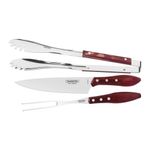 Jogo para Churrasco Tramontina em Aço Inox com Cabo Vermelho Polywood 3 Peças Todo churrasco precisa de utensílios que possibilitem um preparo de qualidade e torne o momento de servir ainda mais prático. Com o Jogo para Churrasco Tramontina em Aço Inox com Cabo Vermelho Polywood 3 Peças você contará com os utensílios que todo bom churrasqueiro precisa ter. O jogo é produzido com lâminas em aço inox, a faca recebe que oferece um excelente corte, o material é altamente durável. Possui um belíssimo cabo de madeira tratada Polywood que resiste à impactos e altas temperaturas, e traz a beleza da linha Churrasco para conquistar a admiração de todos. Lâminas de aço inox. A lâmina da faca têm maior durabilidade do fio devido ao tratamento térmico. As lâminas do garfo e do pegador contam com maior espessura e uma estampagem do aço que garante maior resistência, evitando deformações. Os cabos de madeira tratada Polywood são resistentes à impactos e alta temperaturas garantindo maior resistência e durabilidade. Rebites de alumínio. Podem ir à máquina de lavar louças facilitando seu dia a dia.