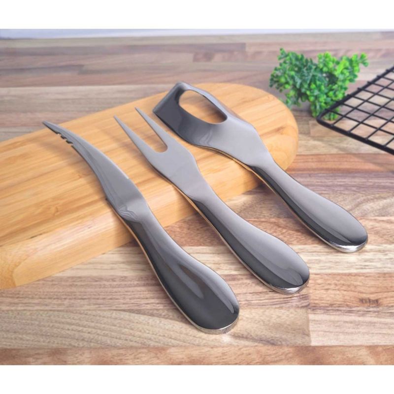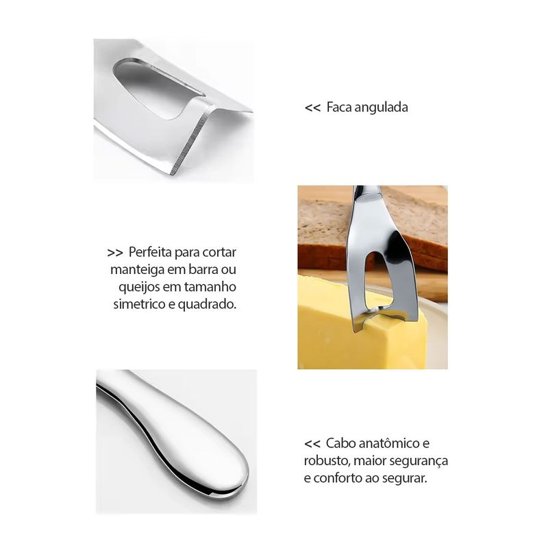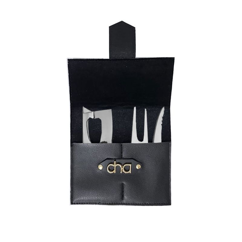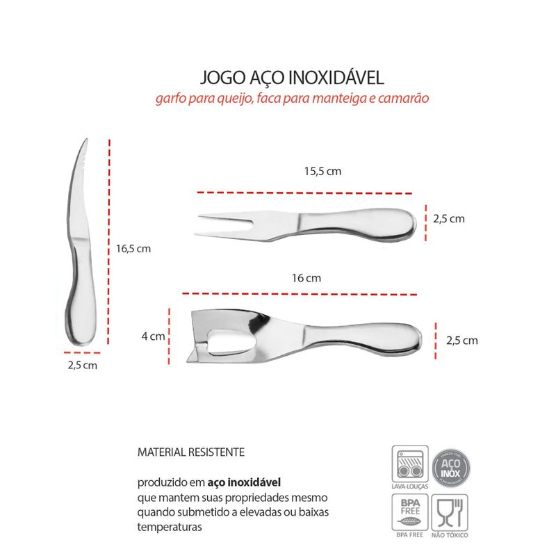 Jogo com faca e garfo para queijo e camarao. O jogo de utensilios sao perfeitos para cortar pedaços simetricos e quadrados. A linha de talheres CASACHA foi produzido em aço inoxidavel de qualidade, design atual, linhas arredondadas, maior espessura e acabamento impecavel. Acompanha estojo confeccionado em material sintetico ecofriendly que lembra couro, revestimento interno aveludado. Perfeito para presentear com muita sofisticaçao. Contem: 1 Estojo Preto 1 Garfo para Queijo Medidas: 15,5 x 2,5 cm 1 Faca para Camarao Medidas: 16,5 x 2,5 cm 1 Faca para Manteiga Medidas: 16 x 4 cm Material: Aço Inoxidavel 410