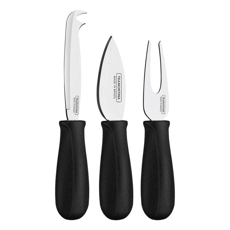 Jogo para Queijos Tramontina Harmoniza com Lâminas em Aço Inox e Cabos de Polipropileno Preto 3 Peças <br><br> Um bom queijo pode dar requinte e muito sabor a várias situações. Por isso, aproveite o Jogo para Queijos Tramontina Harmoniza com Lâminas em Aço Inox e Cabos de Polipropileno Preto 3 Peças. Com ele você terá um garfo e duas facas para queijos duros, semi duros e moles, e conta com lâminas de aço inox com alta durabilidade do fio, devido ao tratamento térmico. Os cabos são de polipropileno, o que os torna altamente resistentes, além de poderem ir à máquina de lavar louças. Um jogo que irá transformar a sua casa num lugar muito mais especial! <br><br> As lâminas de aço inox têm maior durabilidade do fio devido ao tratamento térmico. <br>Os cabos de polipropileno possuem maior resistência e durabilidade. <br>Podem ir à máquina de lavar louças facilitando seu dia a dia.