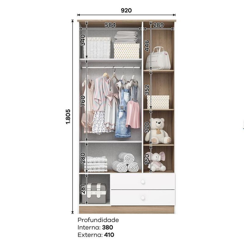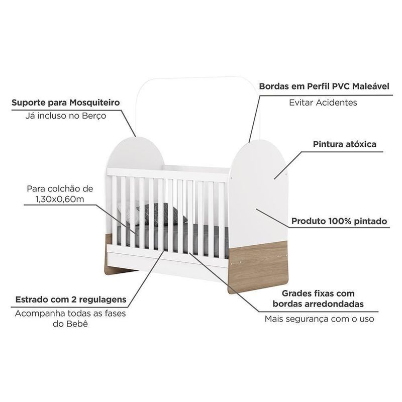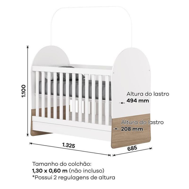 Jogo De Quarto Infantil Magia Com Guarda Roupa E Berço Branco/jequitibá - Móveis Henn Branco/jequitibáJogo de Quarto Infantil Magia com Guarda Roupa e Berço - Móveis Henn O Jogo de Quarto Infantil Magia com Guarda Roupa e Berço é o conjunto ideal para montar um ambiente completo, bonito e funcional. O guarda-roupa oferece ótimo espaço interno com portas, gavetas, prateleiras e cabideiro, além de acabamento fosco e design arredondado. O berço americano conta com pintura atóxica, regulagem de altura e função mini cama, garantindo segurança e praticidade para acompanhar o crescimento da criança.Guarda Roupa Infantil Magia 3 Portas e 2 Gavetas - Móveis Henn - Estrutura em MDP e MDF - Pintura UV - 3 Portas - Porta com usinagem arredondada - Dobradiças metálicas - 2 Gavetas - Corrediças telescópicas - Cabideiro em alumínio - Chapéu em soft - Interna com prateleiras - Puxadores em ABS Berço Americano Mini Cama Magia - Móveis Henn - Estrutura em MDP - Pintura UV atóxica - Padrão americano - Cabeceira arredondada - Suporte para mosquiteiro - Grade em MDF - Espaço entre as barras da grade 5,8cm - 2 Regulagens de altura do estrado - Estrado em MDF e madeira maciça - Peso suportado até 25kg sem impacto - Transforma-se em mini cama - Certificado pelo INMETRO 016817/2024 - Colchão recomendado 70 x 130 cm - Colchão não incluso Dimensões: Tamanho do Guarda-Roupa (L x A x P): 92 x 180,5 x 41 cm Tamanho do Berço (L x A x P): 132,5 x 110 x 68,5 cm Garantia: 3 meses Montagem: O Produto vai desmontado com manual e todos acessórios. Recomendamos que a montagem seja feita por um profissional Recomendação de Limpeza: Utilize pano levemente úmido Observações: - A LOJA se responsabilizará pela entrega dos produtos até onde as rodovias alcançam, entregas fluviais ou aéreas devem ser cotadas a parte. - As imagens são ilustrativas, não acompanham objetos de decoração. - A montagem será de responsabilidade do comprador. Não nos responsabilizamos, no ato da entrega, por subir escadas/elevadores ou transporte por guincho em apartamentos. Eventuais despesas são de responsabilidade do comprador. - Confira as dimensões do produto e certifique-se de que passará normalmente por supostos elevadores, portas, escadas e/ou corredores de sua residência. Para mais informações, acesse nossa Central de Atendimento. NA Branco/Jequitibá