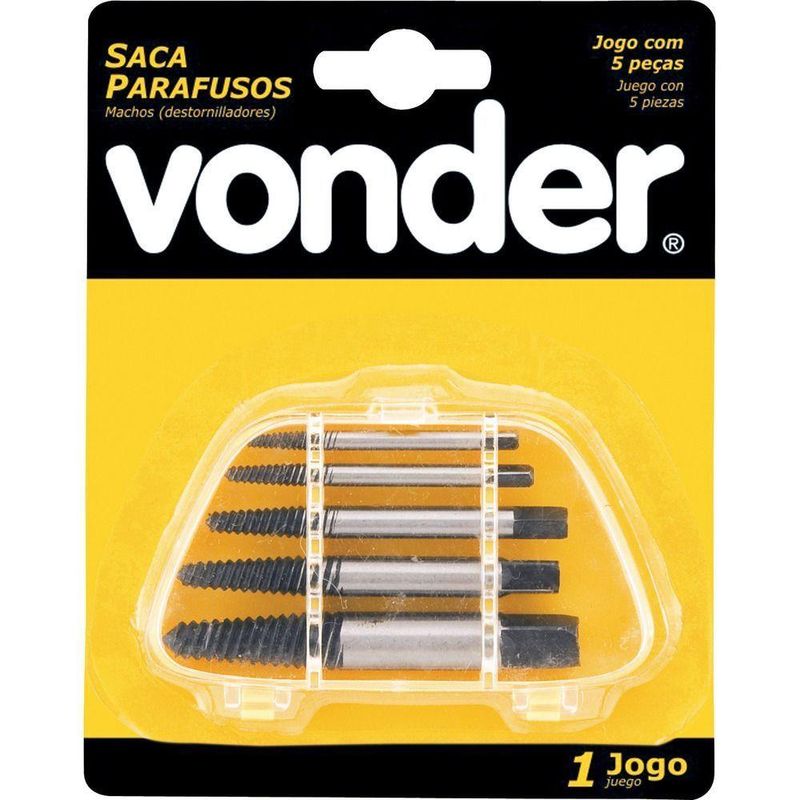 Jogo Saca Parafuso Aço Carbono Com 5 Peças VonderConteúdo da embalagem1 Jogo de saca-parafusos, composto por um estojo plástico com 5 peças, sendo: nº 1, nº 2, nº 3, nº 4 e nº 5, para parafusos de 1/8 a 3/4Aplicações e dicas de usoIndicado para retirar parafusos quebrados em peças ou máquinas. Utilizado com o vira-macho (não acompanha).Destaques e diferenciaisEstojo plástico que facilita a acomodação/organização das peçasDETALHES TÉCNICOSMaterial do saca parafusos:Aço carbono de peças do jogo de saca parafusos:5 peças Produto: Jogo