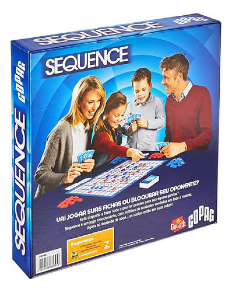 Jogo Sequence - Tabuleiro - COPAG DA AMAZONIASequence, o jogo que desafia, emociona e transforma jogadores em verdadeiros estrategistas Está disposto a fazer tudo o que for preciso para sua equipe ganhar Sequence é um jogo emocionante Agora só depende de você as cartas estão em suas mãos!Detalhes: Certificação: Certificado Pelos Órgãos Autorizados - OCP`S(Organismos De Certificação De Produtos) Registro: 008 141/2021 OCP 0061Características: Conteúdo da Embalagem: 2 decks de Baralho Copag no formato, 1 tabuleiro, 1 conjunto com 48 fichas vermelhas, 1 conjunto com 48 fichas azul, 1 conjunto com 48 fichas verde e 1 Manual de instruções Material/Composição: Plástico Ref: 31553 Marca: Copag Modelo: Sequence Idade Indicada: 7+ Quantidade de Jogadores: 2 a 12 jogadores Código de Barras: 7896192308542 Aviso: As cores podem variar entre as imagens mostradas acima e o produto Imagens meramente ilustrativasGarantia: 3 Meses Contra Defeito de Fabricação