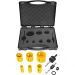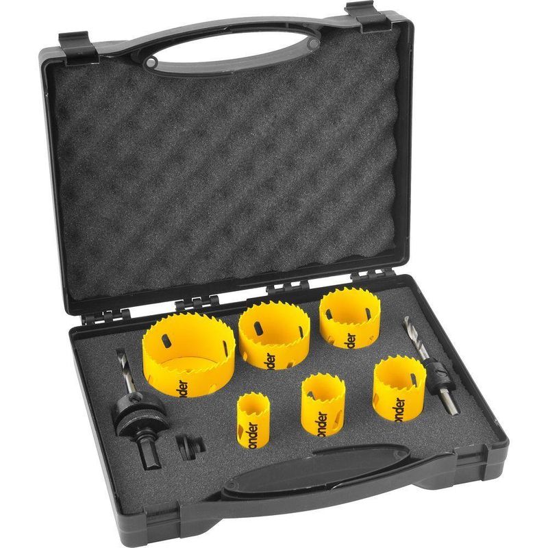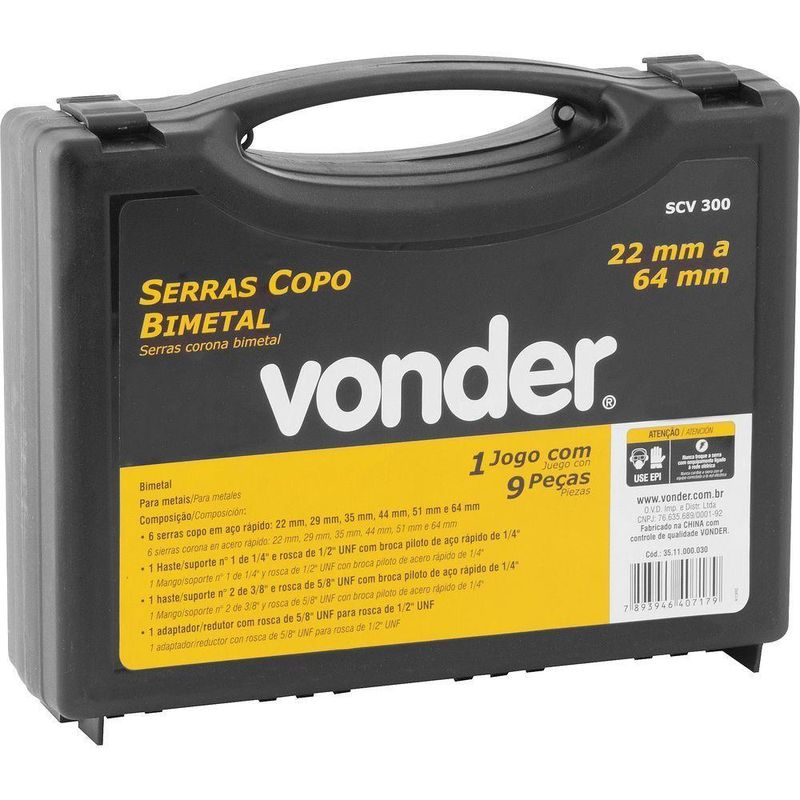 Jogo Serra Copo Aço Rápido 22-64mm Bimetálica Metal VonderConteúdo da embalagem1 Jogo de serras copo, composto por 1 estojo plástico com 9 peças, sendo: 1 haste/suporte n° 1 de 1/4 e rosca de 1/2 UNF com broca piloto de aço rápido de 1/4, 1 haste/suporte n° 2 de 3/8 com rosca de 5/8 UNF com broca piloto de aço rápido de 1/4, 1 adaptador/redutor com rosca de 5/8 UNF para rosca de 1/2 UNF, 1 serra copo de aço rápido 22 mm com rosca de 1/2?, 1 serra copo de aço rápido 29 mm com rosca de 1/2, 1 serra copo de aço rápido 35 mm com rosca de 5/8?, 1 serra copo de aço rápido 44 mm com rosca de 5/8?, 1 serra copo de aço rápido 51 mm com rosca de 5/8? e 1 serra copo de aço rápido 64 mm com rosca de 5/8Aplicações e dicas de usoIndicado para metaisDestaques e diferenciaisPossui estrutura bimetal que proporciona maior resistência e vida útil ao produto. Jogo completo e pronto para uso, pois acompanha o suporte e a broca piloto.DETALHES TÉCNICOSNúmero de peças do jogo de serra copo:09 peçasAltura das serras do jogo de serra copo:22 mm, 29 mm e 35 mm = 50 mm / 44 mm, 51 mm e 64 mm = 44 mmMaterial do jogo de serra copo:Aço rapido Produto: Jogo