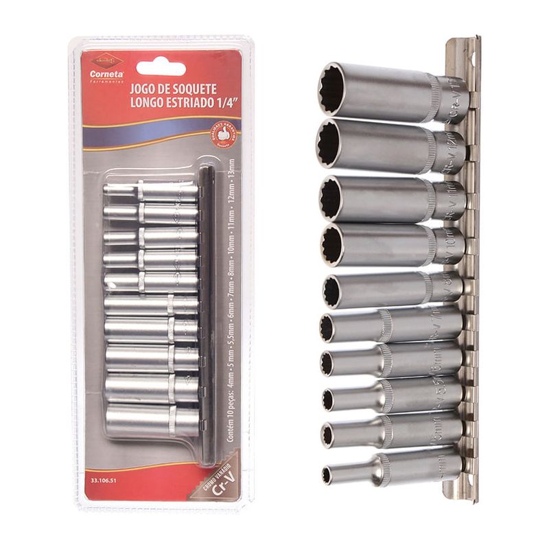 "JOGO DE SOQUETE LONGO ESTRIADO 1/4"" PEÇAS - Dimensões da Peça: - Dimensões da Embalagem:- - Dimensões Inner: - - Dimensões Master:- Material: Aço Cromo Vanádio - Cor:- Tipo de Embalagem:- Marca: - Origem:- Contém: - Garantia: Em condições normais de uso, este produto tem garantia de 90 dias contra defeitos de material e fabricação, mediante apresentação da nota fiscal de compra. Má conservação, manuseio inadequado, quedas ou quaisquer outras avarias produzidas pelo uso incorreto, a garantia oferecida perde a validade. "