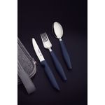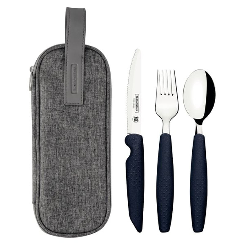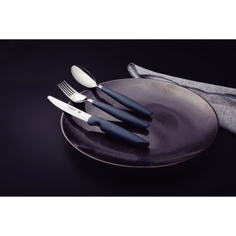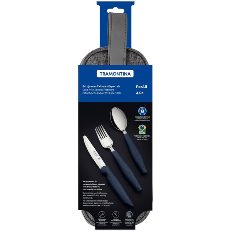 Jogo Talheres Assistivos Tramontina ForAll 4 Peças Lâminas Inox Cabos Cinza Estojo Tramontina - O jogo de talheres Assistivos Tramontina ForAll com lâminas em aço inox e cabos de polipropileno cinza com estojo 4 peças foi desenvolvido com o propósito de proporcionar comodidade, segurança e autonomia durante as refeições. Ele é ideal para pessoas com dificuldade de movimentos nas mãos, visando promover a inclusão social e melhorar a qualidade de vida. É composto por uma faca com serrilha especial e ponta arredondada para um corte potente com maior segurança durante o uso, seu garfo é mais largo e assim como a colher, tem bojo mais profundo para maior estabilidade do alimento. Cada talher tem cabo mais robusto, maior e possui uma textura que proporciona uma melhor firmeza e segurança durante a refeição. Além disso, o jogo de talheres adaptados conta com proteção antimicrobiana e vem acompanhado de um estojo prático, que permite transportá-los facilmente para qualquer lugar em que você queira fazer suas refeições. Uma escolha especial para que você desfrute de uma alimentação de maneira mais fácil e segura! Características Gerais do Produto: Garantia: • 3 Meses