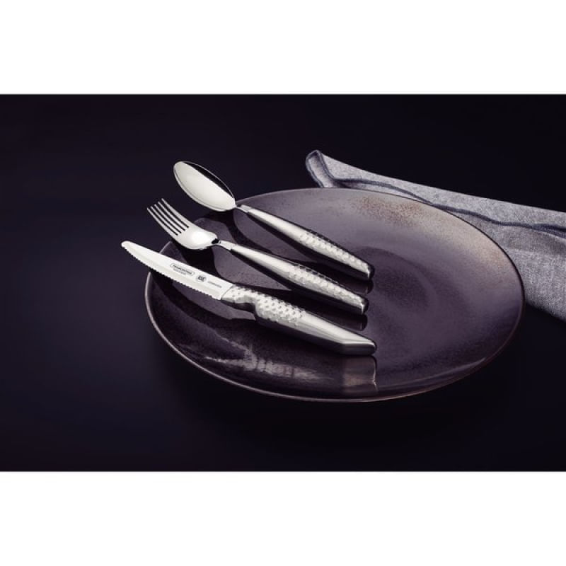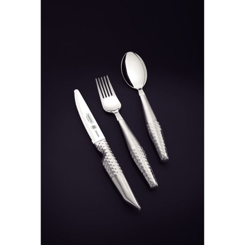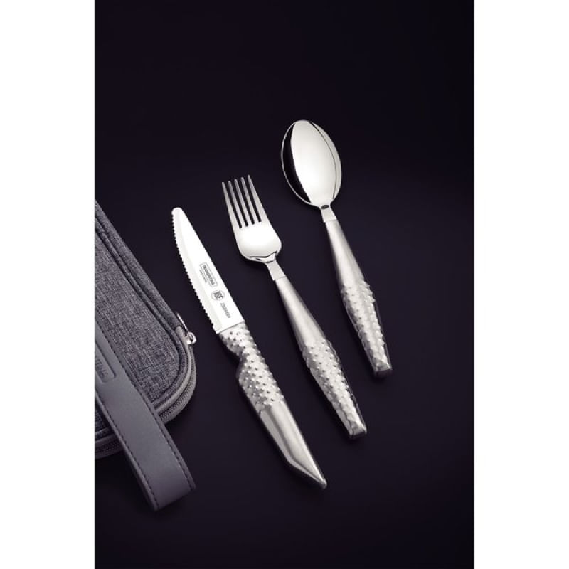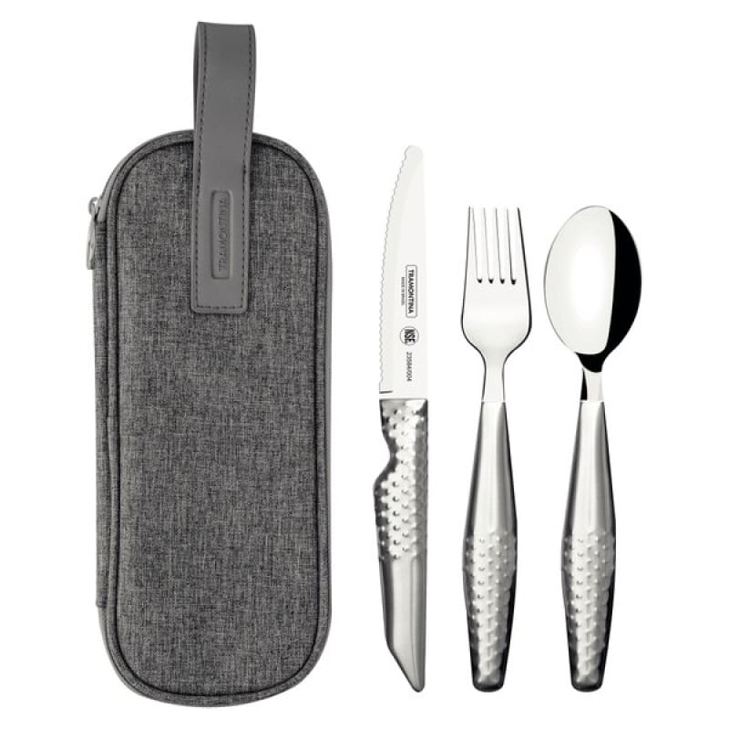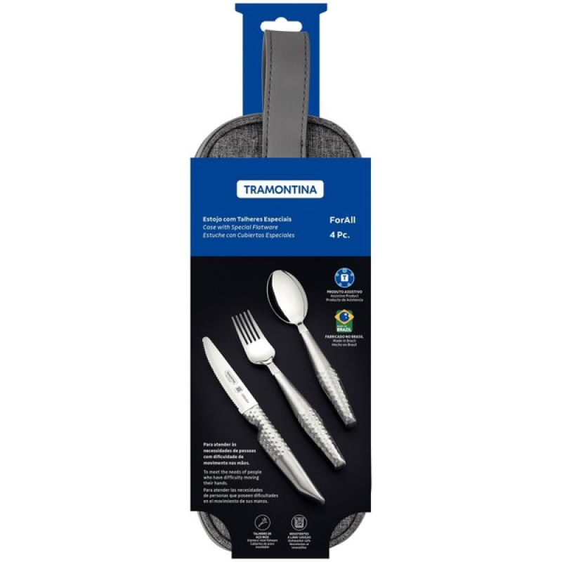 Jogo Talheres Assistivos Tramontina ForAll Aço Inox Estojo 4 Peças Tramontina - O jogo de talheres Assistivos Tramontina ForAll em aço inox com estojo 4 peças será seu companheiro perfeito durante as refeições, oferecendo conforto, estabilidade e autonomia. Ele foi especialmente desenvolvido para atender às necessidades de pessoas com dificuldade de movimentos nas mãos, sendo composto pelos três talheres ideais para as principais refeições: garfo largo e colher que possuem bojo mais profundo para maior estabilidade do alimento e faca com serrilha especial e ponta arredondada para garantir um corte eficaz com segurança. Os cabos dos talheres são mais robustos, maiores e possuem uma textura que proporciona firmeza, segurança e maior conforto durante a refeição, permitindo que você tenha mais confiança e independência ao utilizá-los. Além de todas essas características que visam à melhoria da qualidade de vida, ele ainda acompanha um estojo prático, que permite armazená-lo e levá-lo para qualquer lugar. Garanta o seu e tenha a autonomia que tanto deseja para suas refeições! Características Gerais do Produto: Garantia: • 90 dias para defeito de fabricação