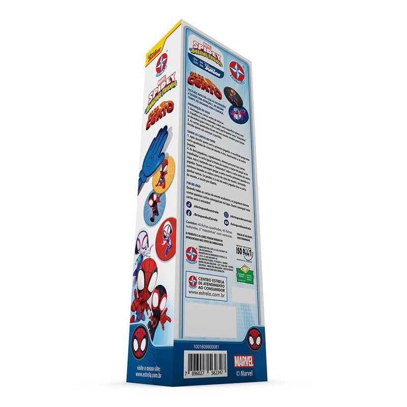 Jogo Tapa Certo Spidey - Brinquedos EstrelaO clássico Tapa Certo, agora com o Spidey e seus amigos espetaculares. As cartas quadradas ficam viradas para baixo enquanto as cartas redondas ficam viradas para cima. Um jogador vira uma carta quadrada revelando a imagem, e rapidamente os jogadores devem dar um tapa com sua mãozinha plástica na carta redonda de mesma imagem. Idade Recomendada: A partir de 5 anos | Material: Plástico e Cartonado | Quantidade de Peças: 45 fichas quadradas, 45 fichas redondas, 2 mãozinhas com ventosas. | Código Inmetro: 009 246 / 2019 | FORMAT: Físico | Nome do jogo de tabuleiro: Jogo Tapa Certo Spidey - Brinquedos Estrela
