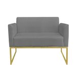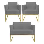 Kit 01 Namoradeira E 02 Poltronas Marisa Suede Base Industrial Metálica Dourado D'rossi Cor GrafiteDo nosso grande sucesso a Elisa, apresentamos para você o Kit 01 Namoradeira e 02 Poltronas Marisa, que vai encher seu ambiente de cor e modernidade! Seu design feito com linhas retas proporciona conforto ao sentar-se sem falar em seus detalhes no assento e no encosto, um luxo! Sua estrutura robusta é confeccionada em madeira de eucalipto proveniente de reflorestamento, o estofamento do assento é composto de espuma prorelax D-23 no encosto e revestido em tecido suede, sua sustentação é dada por uma base industrial metálica, suportando em média até 240 Kg a Namoradeira e 120 Kg cada Poltrona. Dimensões da Namoradeira Altura: 76 cm Largura: 113 cm Profundidade: 64 cm Altura dos chão até o assento: 44 cm Altura do encosto: 35 cm Largura do assento: 95 cm Profundidade do assento: 46 cm Peso: 20 KG Dimensões da Poltrona Altura total: 77 cm Largura total: 65 cm Profundidade total: 64 cm Altura do encosto: 35 cm Largura do assento: 47 cm Profundidade do assento: 46 cm Altura do chão ao assento: 42 cm Espessura do assento: 15 cm Tamanho dos pés: 27 cm Altura do chão ao braço: 60 cm Altura interna do braço: 18 cm Espessura do braço: 10 cm Peso: 13 kg Especificações do Produto Estrutura: Madeira Eucalipto Espuma: Prorelax D-23 Tecido: Suede (100% Poliéster) Tipo de pés: Base Metálica Dourado Peso Suportado: Até 240 Kg Garantia: 90 dias contra defeito de fabricação Montagem: O produto vai montado Instruções de Limpeza: Utilizar um pano limpo e levemente úmido Você irá receber: 03 volumes Observações Relevantes - Todos os produtos vão embalados com total segurança; - As cores dos produtos podem sofrer alterações dependendo do seu monitor; - Para futuras compras, não garantimos a mesma tonalidade de cor, pois existe variação a cada lote do fabricante do tecido; - As imagens são meramente ilustrativas, não acompanham objetos de decoração e eletros; - Confira as dimensões do produto no momento da compra e certifique-se de que passará normalmente por escadas, elevadores, portas e corredores; - Importante: Por se tratar de estofado as medidas podem ter uma pequena variação em até 3 cm; - Não nos responsabilizamos no ato da entrega por montagens, desmontagens, instalações de produtos; - Não nos responsabilizamos no ato da entrega por subir escadas, elevadores, nem utilização de guinchos ou equipamentos similares para acesso a pisos superiores em apartamentos; - Observando as orientações acima, evita-se futuros desagrados ou imprevistos com a entrega do produto. Havendo despesas adicionais, serão de responsabilidade do cliente;Informações Técnicas
