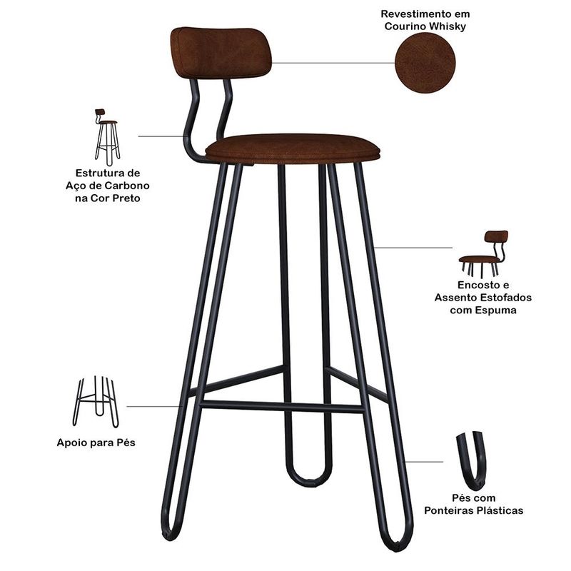 O Kit 02 Banqueta Áris é a escolha ideal para quem busca unir design moderno, conforto e resistência. Com sua estrutura metálica resistente e acabamento refinado, ela combina leveza visual e alta durabilidade. O assento e o encosto são estofados com espuma de alta qualidade, proporcionando maior conforto no uso diário. Possui apoio para os pés, oferecendo mais comodidade, além de pés com ponteiras plásticas que ajudam a proteger o piso. Perfeita para compor áreas gourmet, cozinhas e bancadas, a Banqueta Áris valoriza o ambiente com estilo e funcionalidade. Garanta já a sua! Dimensões da Banqueta (L x A x P) 42 x 98 x 52 cm Altura do chão ao assento: 75 cm Altura do encosto: 11,5 cm Características: Estrutura fixa em aço carbono com pintura epóxi na cor preto. Encosto produzido com Espuma D-22 Assento produzido com Espuma D-28 Revestimento em Courino Whisky Peso suportado de até 120 kg. Produto entregue desmontado, acompanha manual de montagem. - Por se tratar de estofado as medidas podem ter uma pequena variação de até 3 cm. - A tonalidade do produto real poderá ter ligeira variação devido o lote de tecidos. - A limpeza deve ser feita com pano levemente umedecido em água limpa, sem esfregar, não utilizar produtos abrasivos, desengordurantes, álcool ou solvente. Observações importantes: - Produto para uso residencial em ambiente interno, não devendo ficar exposto diretamente ao sol, calor e umidade excessivos. - Pode haver alguma diferença de tonalidade entre a imagem e o produto real, por conta do tratamento de imagens e a calibração de cores do seu monitor. - As imagens são meramente ilustrativas, não acompanham objetos de decoração e eletrônicos. - Ao receber a mercadoria, o cliente deve verificar as condições da embalagem, caso haja alguma avaria não assine o comprovante de recebimento. - Montagem, desmontagem e outras instalações serão de responsabilidade do cliente. Não nos responsabilizamos, no ato da entrega, por subir escadas/elevadores ou pelo transporte por guincho em apartamentos. Eventuais despesas são de responsabilidade do comprador. - Confira as dimensões do produto e certifique-se de que passará normalmente por supostos elevadores, portas, escadas e/ou corredores de sua residência.