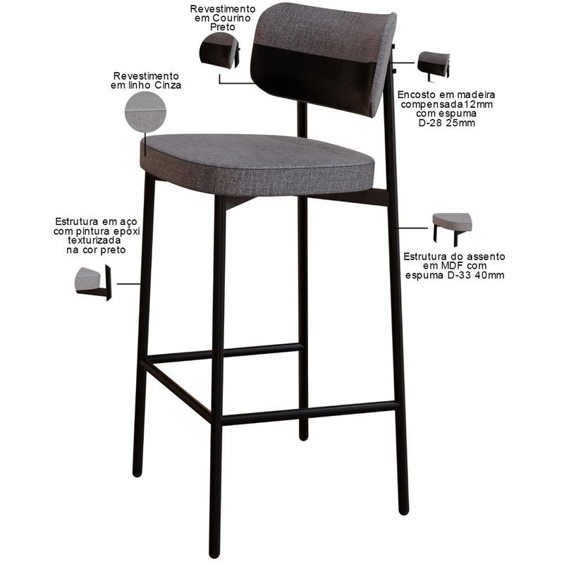 Transforme sua área gourmet com a Banqueta Kaira! Desfrute de momentos inesquecíveis desfrutando do conforto da Banqueta Kaira, projetada para oferecer o máximo de conforto e elegância na sua sala de jantar ou cozinha. Com encosto curvo, ofertando maior conforto no uso, e assento estofado com uma espuma de altíssima qualidade, ela proporciona suporte ideal para longas refeições e conversas agradáveis. Além de combinar durabilidade e estilo, ela é a escolha perfeita para quem busca sofisticação e bem-estar em cada detalhe. Aproveite! Dimensões da Banqueta (L x A x P) 44,2 x 103,5 x 44 cm Altura do chão ao assento: 76,2 Altura do encosto: 21 Características: Estrutura fixa em aço carbono com pintura epóxi na cor preto. Encosto produzido em madeira compensada com espuma D-28, 25mm. Assento produzido em MDF com espuma D-33, 40mm. Revestimento em Linho Cinza Courino Preto. Peso suportado de até 120 kg. Produto entregue desmontado, acompanha manual de montagem. - Por se tratar de estofado as medidas podem ter uma pequena variação de até 3 cm. - A tonalidade do produto real poderá ter ligeira variação devido o lote de tecidos. - A limpeza deve ser feita com pano levemente umedecido em água limpa, sem esfregar, não utilizar produtos abrasivos, desengordurantes, álcool ou solvente. Observações importantes: - Produto para uso residencial em ambiente interno, não devendo ficar exposto diretamente ao sol, calor e umidade excessivos. - Pode haver alguma diferença de tonalidade entre a imagem e o produto real, por conta do tratamento de imagens e a calibração de cores do seu monitor. - As imagens são meramente ilustrativas, não acompanham objetos de decoração e eletrônicos. - Ao receber a mercadoria, o cliente deve verificar as condições da embalagem, caso haja alguma avaria não assine o comprovante de recebimento. - Montagem, desmontagem e outras instalações serão de responsabilidade do cliente. Não nos responsabilizamos, no ato da entrega, por subir escadas/elevadores ou pelo transporte por guincho em apartamentos. Eventuais despesas são de responsabilidade do comprador. - Confira as dimensões do produto e certifique-se de que passará normalmente por supostos elevadores, portas, escadas e/ou corredores de sua residência.