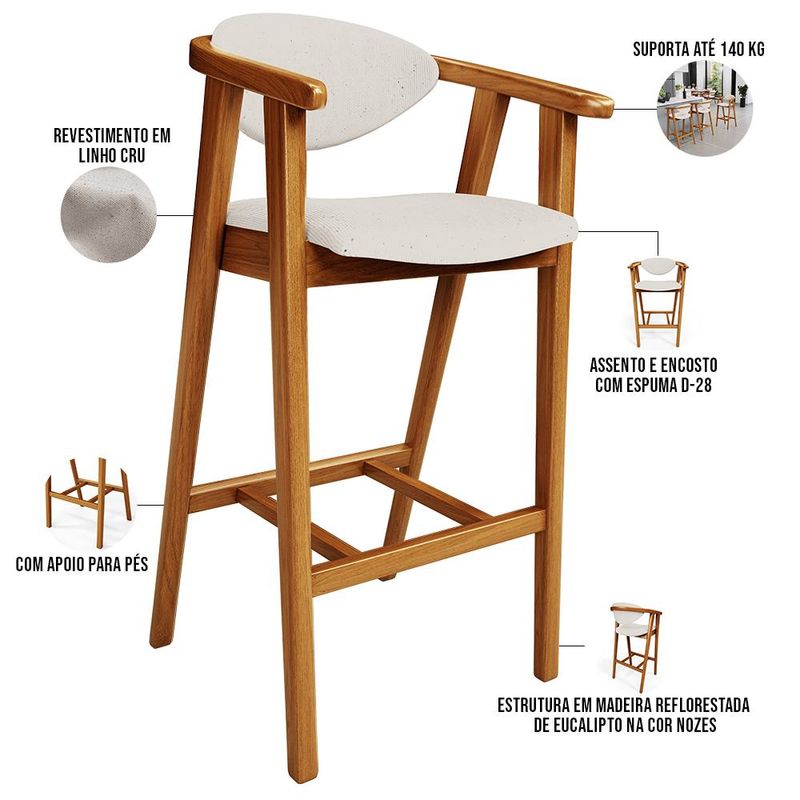 A melhor escolha para os momentos de confraternização no aconchego da sua casa, acaba de chegar! O Kit 02 Banquetas Altas Cecília vem com a personalidade e elegância que sua decoração merece! É ideal desde refeições rápidas, até um Happy Hour com os amigos, família. Seu design único valoriza o ambiente, sem deixar pra trás a beleza e qualidade! Para deixar a sua área gourmet mais aconchegante, ela possui assento e encosto estofados, confeccionados com materiais de excelente qualidade, e extremamente resistentes. Possui altura ideal, garantindo o encaixe perfeito no ambiente, otimizando seu espaço e promovendo máximo conforto. Pode ser usada em bancada, cozinha americana, home bar, ou área gourmet! As possibilidades são infinitas e as combinações ficarão extremamente elegantes. Adquira já a sua! Dimensões do produto (L x A x P) 51 x 102 x 47 cm Medidas Internas: Altura do encosto: 22 cm Altura total do encosto: 33 cm Largura do encosto: 41 cm Altura do assento: 4,5 cm Altura do chão ao braço: 88 cm Profundidade do assento: 46,5 cm Largura do assento: 44 cm Altura interna do braço: 18 cm Altura do chão ao assento: 70 cm Altura do chão ao apoio de pés: 30 cm Altura do apoio de pés: 4,5 cm Largura interna do apoio de pés: 27 cm Características: Estrutura em madeira de reflorestamento de eucalipto vermelho tratado. Revestimento em Linho na cor Cru. Assento com espuma D-28. Encosto com espuma D-28. Peso suportado: Até 140 kg. Estrutura de Madeira na cor Nozes. Produto entregue montado. - Por se tratar de estofado as medidas podem ter uma pequena variação de até 3 cm. - A tonalidade do produto real poderá ter ligeira variação devido o lote de tecidos. - A limpeza deve ser feita com pano levemente umedecido em água limpa, sem esfregar, não utilizar produtos abrasivos, desengordurantes, álcool ou solvente. - Nunca sentar nos braços ou encosto do produto. Observações importantes: - Produto para uso residencial em ambiente interno, não devendo ficar exposto diretamente ao sol, calor e umidade excessivos. - Pode haver alguma diferença de tonalidade entre a imagem e o produto real, por conta do tratamento de imagens e a calibração de cores do seu monitor. - As imagens são meramente ilustrativas, não acompanham objetos de decoração e eletrônicos. - Ao receber a mercadoria, o cliente deve verificar as condições da embalagem, caso haja alguma avaria não assine o comprovante de recebimento. - Montagem, desmontagem e outras instalações serão de responsabilidade do cliente. Não nos responsabilizamos, no ato da entrega, por subir escadas/elevadores ou pelo transporte por guincho em apartamentos. Eventuais despesas são de responsabilidade do comprador. - Confira as dimensões do produto e certifique-se de que passará normalmente por supostos elevadores, portas, escadas e/ou corredores de sua residência.