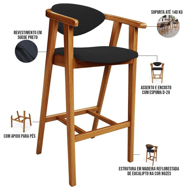 A melhor escolha para os momentos de confraternização no aconchego da sua casa, acaba de chegar! O Kit 02 Banquetas Altas Cecília vem com a personalidade e elegância que sua decoração merece! É ideal desde refeições rápidas, até um Happy Hour com os amigos, família. Seu design único valoriza o ambiente, sem deixar pra trás a beleza e qualidade! Para deixar a sua área gourmet mais aconchegante, ela possui assento e encosto estofados, confeccionados com materiais de excelente qualidade, e extremamente resistentes. Possui altura ideal, garantindo o encaixe perfeito no ambiente, otimizando seu espaço e promovendo máximo conforto. Pode ser usada em bancada, cozinha americana, home bar, ou área gourmet! As possibilidades são infinitas e as combinações ficarão extremamente elegantes. Adquira já a sua! Dimensões do produto (L x A x P) 51 x 102 x 47 cm Medidas Internas: Altura do encosto: 22 cm Altura total do encosto: 33 cm Largura do encosto: 41 cm Altura do assento: 4,5 cm Altura do chão ao braço: 88 cm Profundidade do assento: 46,5 cm Largura do assento: 44 cm Altura interna do braço: 18 cm Altura do chão ao assento: 70 cm Altura do chão ao apoio de pés: 30 cm Altura do apoio de pés: 4,5 cm Largura interna do apoio de pés: 27 cm Características: Estrutura em madeira de reflorestamento de eucalipto vermelho tratado. Revestimento em Suede na cor Preto. Assento com espuma D-28. Encosto com espuma D-28. Peso suportado: Até 140 kg. Estrutura de Madeira na cor Nozes. Produto entregue montado. - Por se tratar de estofado as medidas podem ter uma pequena variação de até 3 cm. - A tonalidade do produto real poderá ter ligeira variação devido o lote de tecidos. - A limpeza deve ser feita com pano levemente umedecido em água limpa, sem esfregar, não utilizar produtos abrasivos, desengordurantes, álcool ou solvente. - Nunca sentar nos braços ou encosto do produto. Observações importantes: - Produto para uso residencial em ambiente interno, não devendo ficar exposto diretamente ao sol, calor e umidade excessivos. - Pode haver alguma diferença de tonalidade entre a imagem e o produto real, por conta do tratamento de imagens e a calibração de cores do seu monitor. - As imagens são meramente ilustrativas, não acompanham objetos de decoração e eletrônicos. - Ao receber a mercadoria, o cliente deve verificar as condições da embalagem, caso haja alguma avaria não assine o comprovante de recebimento. - Montagem, desmontagem e outras instalações serão de responsabilidade do cliente. Não nos responsabilizamos, no ato da entrega, por subir escadas/elevadores ou pelo transporte por guincho em apartamentos. Eventuais despesas são de responsabilidade do comprador. - Confira as dimensões do produto e certifique-se de que passará normalmente por supostos elevadores, portas, escadas e/ou corredores de sua residência.