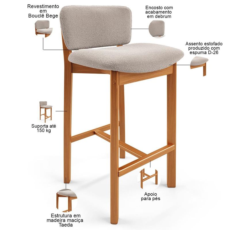 Na cozinha ou qualquer outro ambiente, a Banqueta Dara se destaca por seu design clássico, sem deixar de exaltar a delicadeza deste modelo. Com uma estrutura de madeira que exala nobreza e sofisticação, essa banqueta estofada é o convite perfeito para momentos de confraternizar. O estofado macio, harmoniza com os demais elementos do ambiente, além do encosto proporcionar muito conforto enquanto se desfruta de momentos incríveis com aconchego. A vida é feita de pequenas celebrações, e essa banqueta está pronta para torná-las ainda mais especiais. Adicione ao seu carrinho e aproveite! Dimensões da Banqueta (L x A x P) 46,6 cm x 83 cm x 47 cm Medidas Internas Altura do chão ao assento: 74 cm Largura do assento: 44,5 cm Profundidade livre do assento: 37 cm Altura do encosto: 19 cm Largura do encosto: 39 cm Altura do apoio de pé ao chão: 29 cm Características: Estrutura em madeira de reflorestamento Taeda com acabamento envernizado na tonalidade Castanho. Revestimento em Bouclê Creme. Encosto com acabamento em debrum. Assento estofado fixo composto por espuma D-26. Suporta até 150 kg. Produto entregue montado. - Por se tratar de estofado as medidas podem ter uma pequena variação de até 3 cm. - A tonalidade do produto real poderá ter ligeira variação devido o lote de tecidos. - A limpeza deve ser feita com pano levemente umedecido em água limpa, sem esfregar, não utilizar produtos abrasivos, desengordurantes, álcool ou solvente. Observações importantes: - Produto para uso residencial em ambiente interno, não devendo ficar exposto diretamente ao sol, calor e umidade excessivos. - Pode haver alguma diferença de tonalidade entre a imagem e o produto real, por conta do tratamento de imagens e a calibração de cores do seu monitor. - As imagens são meramente ilustrativas, não acompanham objetos de decoração e eletrônicos. - Ao receber a mercadoria, o cliente deve verificar as condições da embalagem, caso haja alguma avaria não assine o comprovante de recebimento. - Montagem, desmontagem e outras instalações serão de responsabilidade do cliente. Não nos responsabilizamos, no ato da entrega, por subir escadas/elevadores ou pelo transporte por guincho em apartamentos. Eventuais despesas são de responsabilidade do comprador. - Confira as dimensões do produto e certifique-se de que passará normalmente por supostos elevadores, portas, escadas e/ou corredores de sua residência.