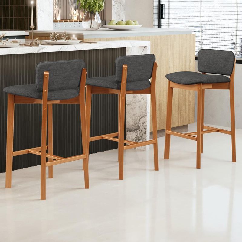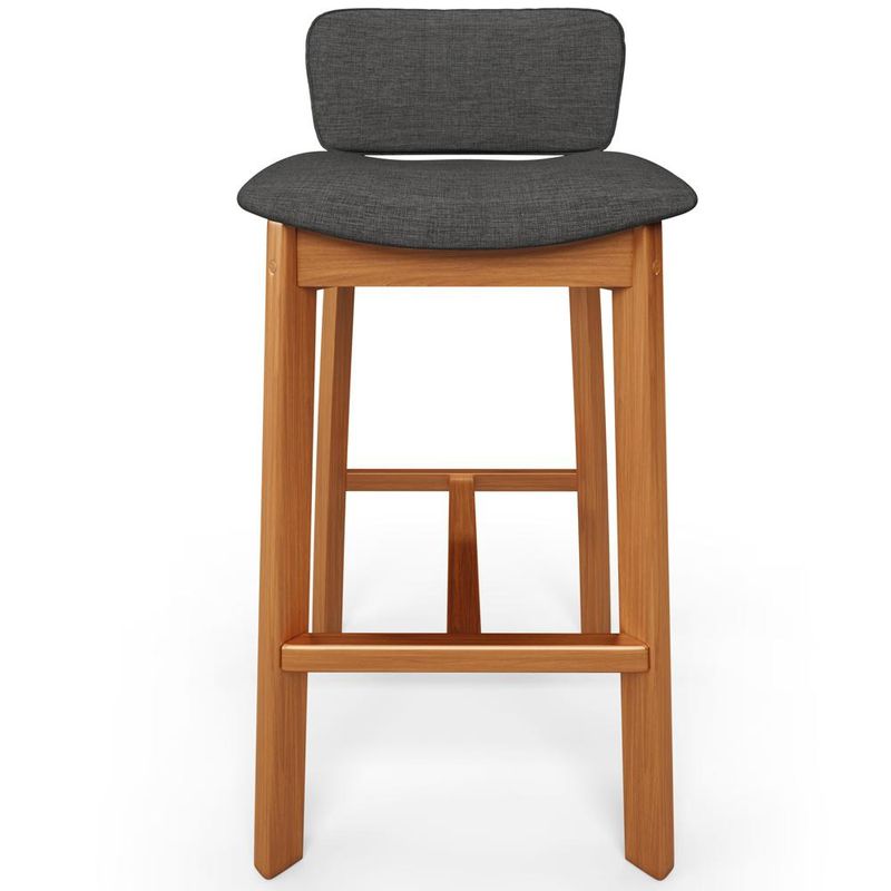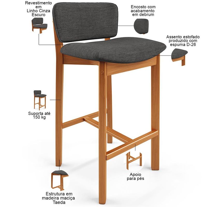 Na cozinha ou qualquer outro ambiente, a Banqueta Dara se destaca por seu design clássico, sem deixar de exaltar a delicadeza deste modelo. Com uma estrutura de madeira que exala nobreza e sofisticação, essa banqueta estofada é o convite perfeito para momentos de confraternizar. O estofado macio, harmoniza com os demais elementos do ambiente, além do encosto proporcionar muito conforto enquanto se desfruta de momentos incríveis com aconchego. A vida é feita de pequenas celebrações, e essa banqueta está pronta para torná-las ainda mais especiais. Adicione ao seu carrinho e aproveite! Dimensões da Banqueta (L x A x P) 46,6 cm x 83 cm x 47 cm Medidas Internas Altura do chão ao assento: 74 cm Largura do assento: 44,5 cm Profundidade livre do assento: 37 cm Altura do encosto: 19 cm Largura do encosto: 39 cm Altura do apoio de pé ao chão: 29 cm Características: Estrutura em madeira de reflorestamento Taeda com acabamento envernizado na tonalidade Castanho. Revestimento em Linho Cinza Escuro. Encosto com acabamento em debrum. Assento estofado fixo composto por espuma D-26. Suporta até 150 kg. Produto entregue montado. - Por se tratar de estofado as medidas podem ter uma pequena variação de até 3 cm. - A tonalidade do produto real poderá ter ligeira variação devido o lote de tecidos. - A limpeza deve ser feita com pano levemente umedecido em água limpa, sem esfregar, não utilizar produtos abrasivos, desengordurantes, álcool ou solvente. Observações importantes: - Produto para uso residencial em ambiente interno, não devendo ficar exposto diretamente ao sol, calor e umidade excessivos. - Pode haver alguma diferença de tonalidade entre a imagem e o produto real, por conta do tratamento de imagens e a calibração de cores do seu monitor. - As imagens são meramente ilustrativas, não acompanham objetos de decoração e eletrônicos. - Ao receber a mercadoria, o cliente deve verificar as condições da embalagem, caso haja alguma avaria não assine o comprovante de recebimento. - Montagem, desmontagem e outras instalações serão de responsabilidade do cliente. Não nos responsabilizamos, no ato da entrega, por subir escadas/elevadores ou pelo transporte por guincho em apartamentos. Eventuais despesas são de responsabilidade do comprador. - Confira as dimensões do produto e certifique-se de que passará normalmente por supostos elevadores, portas, escadas e/ou corredores de sua residência.