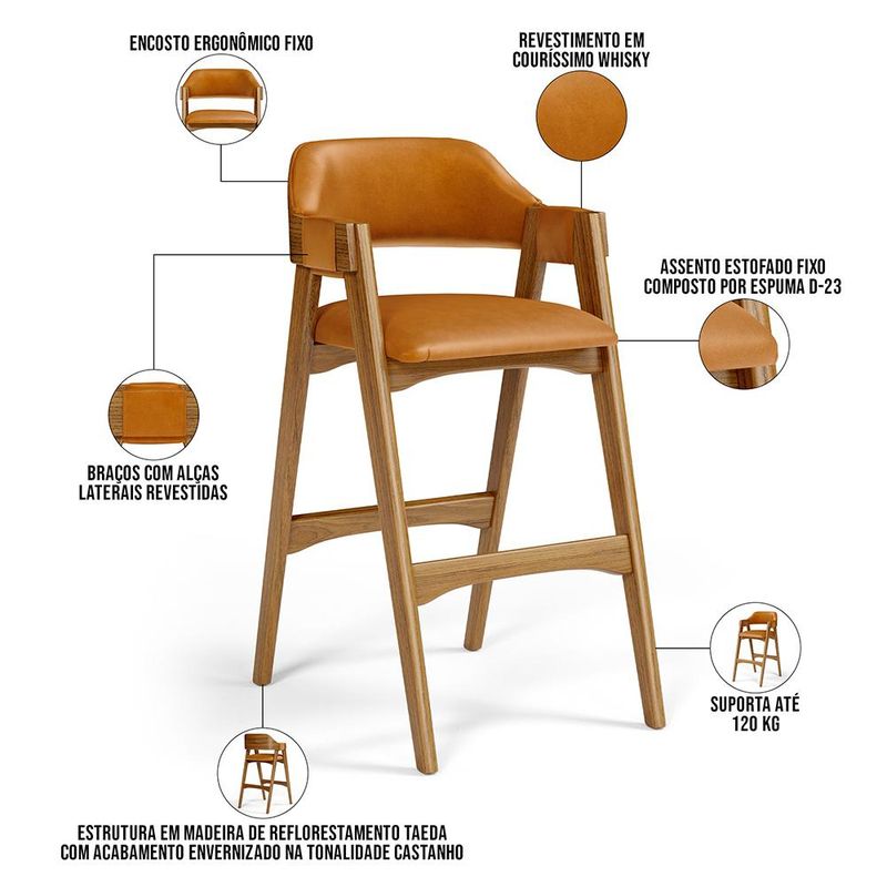 Na cozinha ou qualquer outro ambiente, o Kit 02 Banquetas Altas Suran, da Lyam Decor, se destaca com seu design moderno e elegante. Com uma estrutura de madeira que exala sofisticação, essa banqueta estofada é o convite perfeito para momentos de descontração e sabor. O estofado macio, harmoniza com os demais elementos do ambiente, além de proporcionar conforto enquanto se saboreia um café da manhã preguiçoso ou uma taça de vinho ao entardecer. Já o encosto curvo e os braços delicadamente projetados abraçam o corpo, transformando cada instante em uma experiência acolhedora. Ideal para a ilha gourmet, onde a criatividade culinária ganha vida, ou para um barzinho que respira estilo, essa banqueta é mais do que um móvel; é um ponto de encontro, um espaço de risadas e histórias compartilhadas. Em cada assento, a promessa de momentos memoráveis. A vida é feita de pequenas celebrações, e essa banqueta alta está pronta para torná-las ainda mais especiais. Adicione ao seu carrinho e aproveite! Dimensões da Banqueta (L x A x P) 54 cm x 105 cm x 72 cm Medidas Internas Largura do assento: 46 cm Profundidade livre do assento: 46 cm Altura do encosto: 30 cm Altura interna dos braços: 16 cm Altura dos braços ao chão: 93 cm Altura do assento ao chão: 76 cm Altura do apoio de pé ao chão: 36 cm Características: Estrutura em madeira de reflorestamento Taeda com acabamento envernizado na tonalidade Castanho. Revestimento em Couríssimo de alta qualidade na tonalidade Whiskyl. Encosto ergonômico fixo. Assento estofado fixo composto por espuma D-23. Braços com alças laterais revestidas. Suporta até 120 kg cada. Produto entregue montado. - Por se tratar de estofado as medidas podem ter uma pequena variação de até 3 cm. - A tonalidade do produto real poderá ter ligeira variação devido o lote de tecidos. - A limpeza deve ser feita com pano levemente umedecido em água limpa, sem esfregar, não utilizar produtos abrasivos, desengordurantes, álcool ou solvente. Observações importantes: - Produto para uso residencial em ambiente interno, não devendo ficar exposto diretamente ao sol, calor e umidade excessivos. - Pode haver alguma diferença de tonalidade entre a imagem e o produto real, por conta do tratamento de imagens e a calibração de cores do seu monitor. - As imagens são meramente ilustrativas, não acompanham objetos de decoração e eletrônicos. - Ao receber a mercadoria, o cliente deve verificar as condições da embalagem, caso haja alguma avaria não assine o comprovante de recebimento. - Montagem, desmontagem e outras instalações serão de responsabilidade do cliente. Não nos responsabilizamos, no ato da entrega, por subir escadas/elevadores ou pelo transporte por guincho em apartamentos. Eventuais despesas são de responsabilidade do comprador. - Confira as dimensões do produto e certifique-se de que passará normalmente por supostos elevadores, portas, escadas e/ou corredores de sua residência.