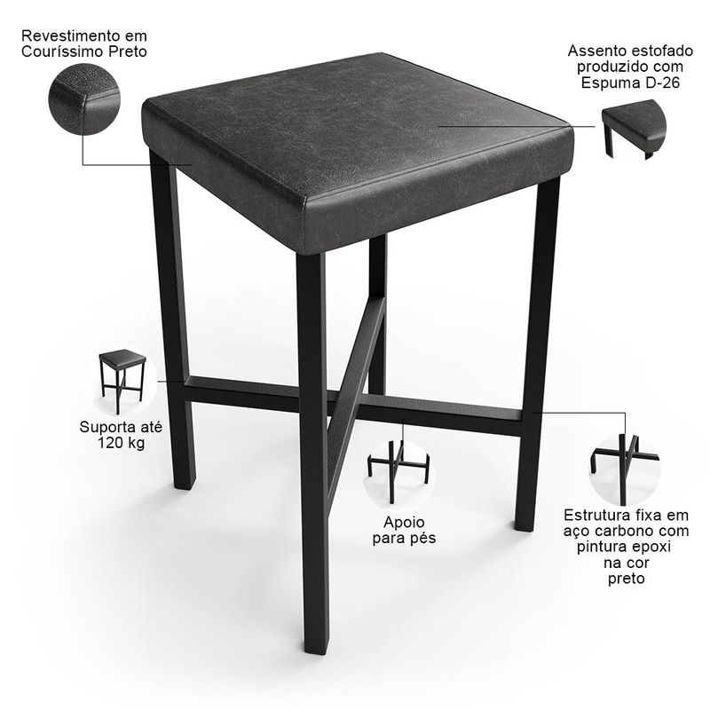 Transforme qualquer ambiente com a elegância e durabilidade com a Banqueta Stella! Com estrutura em ferro, ela é ideal para cozinhas, bares, áreas de lazer ou qualquer espaço que precise de um toque de sofisticação e modernidade. Sua versatilidade capacita o uso nos mais diversos ambientes como, cozinhas, bares, áreas de lazer, escritórios e muito mais. Adicione um toque de estilo e funcionalidade ao seu espaço com esta banqueta versátil e elegante. Aproveite já! Dimensões da Banqueta (L x A x P) 37 x 47 x 35 cm Medidas Internas: Altura do assento: 5 cm Largura do assento: 30 cm Profundidade do assento: 30 cm Altura do apoio de pés: 16 cm Características: Assento produzido com espuma D-26. Estrutura fixa em aço carbono com pintura epóxi na cor preto. Revestimento em Couríssimo Preto. Suporta até 120 kg. - Por se tratar de estofado as medidas podem ter uma pequena variação de até 3 cm. - A tonalidade do produto real poderá ter ligeira variação devido o lote de tecidos. - A limpeza deve ser feita com pano levemente umedecido em água limpa, sem esfregar, não utilizar produtos abrasivos, desengordurantes, álcool ou solvente. Observações importantes: - Produto para uso residencial em ambiente interno, não devendo ficar exposto diretamente ao sol, calor e umidade excessivos. - Pode haver alguma diferença de tonalidade entre a imagem e o produto real, por conta do tratamento de imagens e a calibração de cores do seu monitor. - As imagens são meramente ilustrativas, não acompanham objetos de decoração e eletrônicos. - Ao receber a mercadoria, o cliente deve verificar as condições da embalagem, caso haja alguma avaria não assine o comprovante de recebimento. - Montagem, desmontagem e outras instalações serão de responsabilidade do cliente. Não nos responsabilizamos, no ato da entrega, por subir escadas/elevadores ou pelo transporte por guincho em apartamentos. Eventuais despesas são de responsabilidade do comprador. - Confira as dimensões do produto e certifique-se de que passará normalmente por supostos elevadores, portas, escadas e/ou corredores de sua residência.