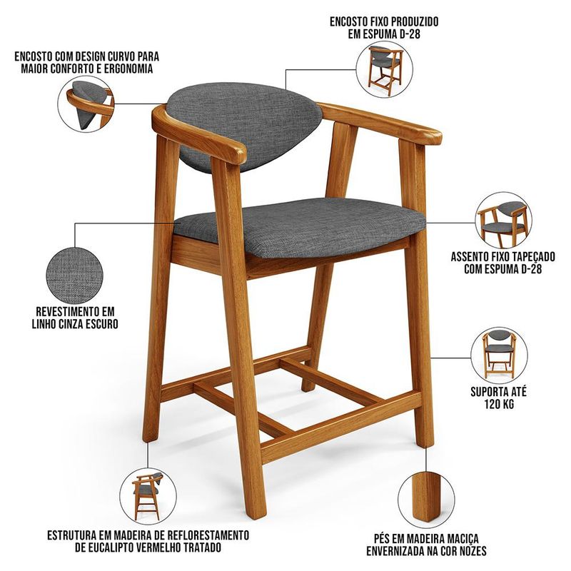 Transforme qualquer ambiente em um espaço sofisticado com o Kit 02 Banquetas Baixa Cecília, da Lyam Decor. Esse kit de banquetas combina design moderno e funcionalidade, já que é ideal para cozinha, sala de jantar, bancada ou área gourmet. Além disso, são feitas com madeira de eucalipto vermelho tratado, o que garante durabilidade e sustentabilidade. Já o assento e encosto estofados com espuma de alta densidade proporcionam máximo conforto durante suas refeições ou momentos de descontração. A versatilidade dessa banqueta de madeira com encosto faz dela a escolha perfeita para quem busca elegância e praticidade em cada detalhe. Leve mais alegria aos momentos com a família e amigos com a Banqueta Cecília. Dimensões da Banqueta (L x A x P) 51 x 90 x 47 cm Medidas Internas: Altura do chão ao assento: 60 cm Assento livre (L x A x P): 44 x 4,5 x 46,5 cm Encosto livre (L x A): 41 x 22 cm Altura total do encosto: 33 cm Altura interna do braço: 18 cm Altura do chão ao início do braço: 76 cm Altura do chão ao apoio de pés: 17 cm Largura interna do apoio de pés: 27 cm Altura do apoio de pés: 4,5 cm Características: Estrutura em madeira de reflorestamento de eucalipto vermelho tratado. Revestimento em tecido Linho de alta qualidade na cor Cinza Escuro. Assento e encosto fixos tapeçados com espuma D-28. Encosto com design curvo para maior conforto e ergonomia. Pés em madeira maciça envernizada na cor Nozes. Peso suportado: Até 120 kg cada. - Nunca sentar nos braços ou encosto do produto. - Por se tratar de estofado as medidas podem ter uma pequena variação de até 3 cm. - A tonalidade do produto real poderá ter ligeira variação devido o lote de tecidos. - Indicado para uso residencial, sua limpeza deve ser feita com pano levemente umedecido em água limpa, sem esfregar, não utilizar produtos abrasivos, desengordurantes, álcool ou solvente. Observações importantes: - Produto para uso residencial em ambiente interno, não devendo ficar exposto diretamente ao sol, calor e umidade excessivos. - Pode haver alguma diferença de tonalidade entre a imagem e o produto real, por conta do tratamento de imagens e a calibração de cores do seu monitor. - As imagens são meramente ilustrativas, não acompanham objetos de decoração e eletrônicos. - Ao receber a mercadoria, o cliente deve verificar as condições da embalagem, caso haja alguma avaria não assine o comprovante de recebimento e entre em contato com nossa loja para orientações. - Montagem, desmontagem e outras instalações serão de responsabilidade do cliente. Não nos responsabilizamos, no ato da entrega, por subir escadas/elevadores ou pelo transporte por guincho em apartamentos. Eventuais despesas são de responsabilidade do comprador. - Confira as dimensões do produto e certifique-se de que passará normalmente por supostos elevadores, portas, escadas e/ou corredores de sua residência. - Para mais informações, acesse nossa Central de Atendimento.