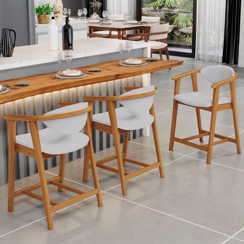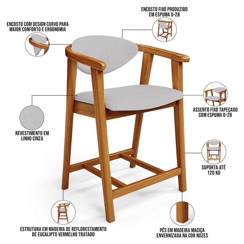 Crie um ambiente sofisticado e acolhedor com o Kit 02 Banquetas Baixa Cecília, da Lyam Decor. Com design moderno essa banqueta é uma peça muito versátil, pois você pode aproveitá-la em diversos ambientes, desde cozinha, sala de jantar, bancada até a área gourmet ou bar e, assim, agregar o máximo de beleza e conforto. Afinal, essa banqueta de madeira se destaca pela sua estrutura robusta que resistência e durabilidade. Já o assento estofado oferece o máximo conforto, enquanto o encosto proporciona suporte ergonômico sem igual. Combinando elegância e praticidade, essa banqueta baixa com encosto é perfeita para quem deseja um toque de requinte em qualquer ambiente. Adicione um charme especial ao seu lar com essa peça indispensável. Adicione ao seu carrinho e desfrute momentos de alegria com a Banqueta Cecília! Dimensões da Banqueta (L x A x P) 51 x 90 x 47 cm Medidas Internas: Altura do chão ao assento: 60 cm Assento livre (L x A x P): 44 x 4,5 x 46,5 cm Encosto livre (L x A): 41 x 22 cm Altura total do encosto: 33 cm Altura interna do braço: 18 cm Altura do chão ao início do braço: 76 cm Altura do chão ao apoio de pés: 17 cm Largura interna do apoio de pés: 27 cm Altura do apoio de pés: 4,5 cm Características: Estrutura em madeira de reflorestamento de eucalipto vermelho tratado. Revestimento em tecido Linho de alta qualidade na cor Cinza. Assento e encosto fixos tapeçados com espuma D-28. Encosto com design curvo para maior conforto e ergonomia. Pés em madeira maciça envernizada na cor Nozes. Peso suportado: Até 120 kg. - Nunca sentar nos braços ou encosto do produto. - Por se tratar de estofado as medidas podem ter uma pequena variação de até 3 cm. - A tonalidade do produto real poderá ter ligeira variação devido o lote de tecidos. - Indicado para uso residencial, sua limpeza deve ser feita com pano levemente umedecido em água limpa, sem esfregar, não utilizar produtos abrasivos, desengordurantes, álcool ou solvente. Observações importantes: - Produto para uso residencial em ambiente interno, não devendo ficar exposto diretamente ao sol, calor e umidade excessivos. - Pode haver alguma diferença de tonalidade entre a imagem e o produto real, por conta do tratamento de imagens e a calibração de cores do seu monitor. - As imagens são meramente ilustrativas, não acompanham objetos de decoração e eletrônicos. - Ao receber a mercadoria, o cliente deve verificar as condições da embalagem, caso haja alguma avaria não assine o comprovante de recebimento e entre em contato com nossa loja para orientações. - Montagem, desmontagem e outras instalações serão de responsabilidade do cliente. Não nos responsabilizamos, no ato da entrega, por subir escadas/elevadores ou pelo transporte por guincho em apartamentos. Eventuais despesas são de responsabilidade do comprador. - Confira as dimensões do produto e certifique-se de que passará normalmente por supostos elevadores, portas, escadas e/ou corredores de sua residência. - Para mais informações, acesse nossa Central de Atendimento.