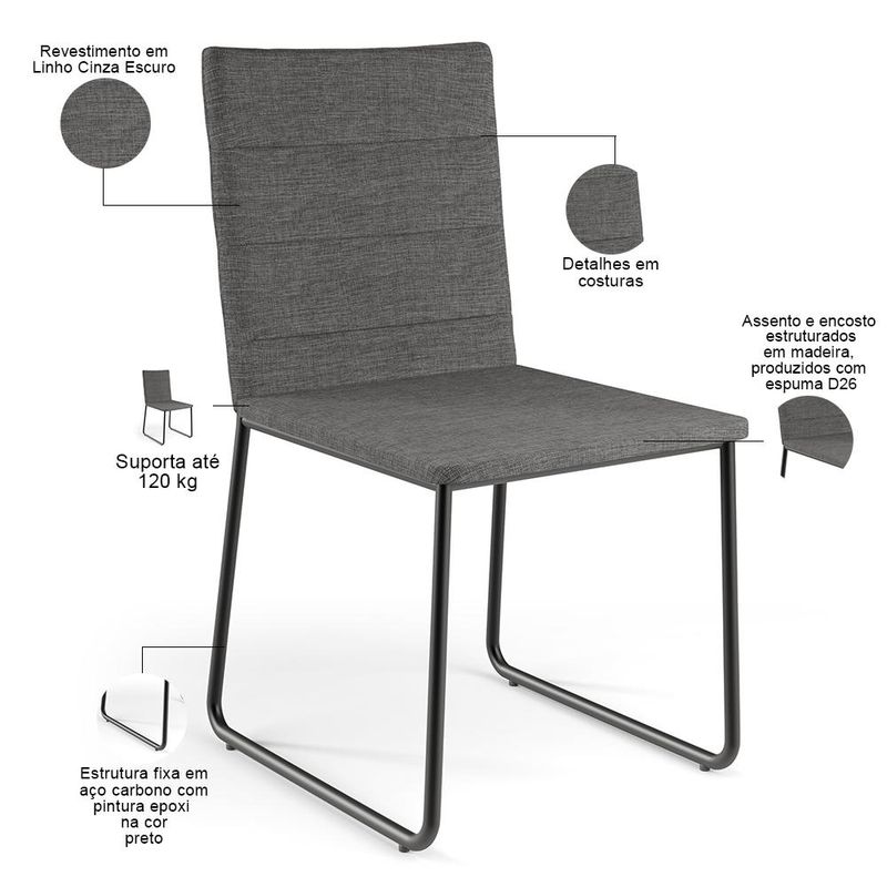 O espetáculo que é a Cadeira Maya, chega para agregar ainda mais valor na decoração da sua casa! Sua estrutura em aço remete-nos ao estilo industrial que surgiu em Nova York no século XX, já o assento e encosto estofados trazem equilíbrio e conforto criando a combinação perfeita para o ambiente. Podendo ser disposta em salas de Jantar Preto, cozinha ou espaço gourmet, dentre outras opções, se destaca com muita elegância e personalidade. Recepcione os amigos e familiares na sua casa com o melhor do conforto e design Slim de forma agradável. Você e seu lar merecem, aproveite! Dimensões da Cadeira (L x A x P) 44 x 85 x 51 cm Medidas Internas: Altura do Assento ao chão: 45 cm Largura do assento: 40,5 cm Profundidade do assento: 43 cm Altura do encosto: 41,5 cm Largura do encosto: 34 cm Características: Assento e encosto estruturados em madeira, produzidos com espuma D-26, com detalhes em costuras. Pintura eletrostática epóxi de alta resistência à riscos e umidade, na cor preto. Revestimento em Linho Cinza Escuro. Suporta até 100kg. - Produto entregue desmontado. - Por se tratar de estofado as medidas podem ter uma pequena variação de até 3 cm. - A tonalidade do produto real poderá ter ligeira variação devido o lote de tecidos. - A limpeza deve ser feita com pano levemente umedecido em água limpa, sem esfregar, não utilizar produtos abrasivos, desengordurantes, álcool ou solvente. Observações importantes: - Produto para uso residencial em ambiente interno, não devendo ficar exposto diretamente ao sol, calor e umidade excessivos. - Pode haver alguma diferença de tonalidade entre a imagem e o produto real, por conta do tratamento de imagens e a calibração de cores do seu monitor. - As imagens são meramente ilustrativas, não acompanham objetos de decoração e eletrônicos. - Ao receber a mercadoria, o cliente deve verificar as condições da embalagem, caso haja alguma avaria não assine o comprovante de recebimento. - Montagem, desmontagem e outras instalações serão de responsabilidade do cliente. Não nos responsabilizamos, no ato da entrega, por subir escadas/elevadores ou pelo transporte por guincho em apartamentos. Eventuais despesas são de responsabilidade do comprador. - Confira as dimensões do produto e certifique-se de que passará normalmente por supostos elevadores, portas, escadas e/ou corredores de sua residência.