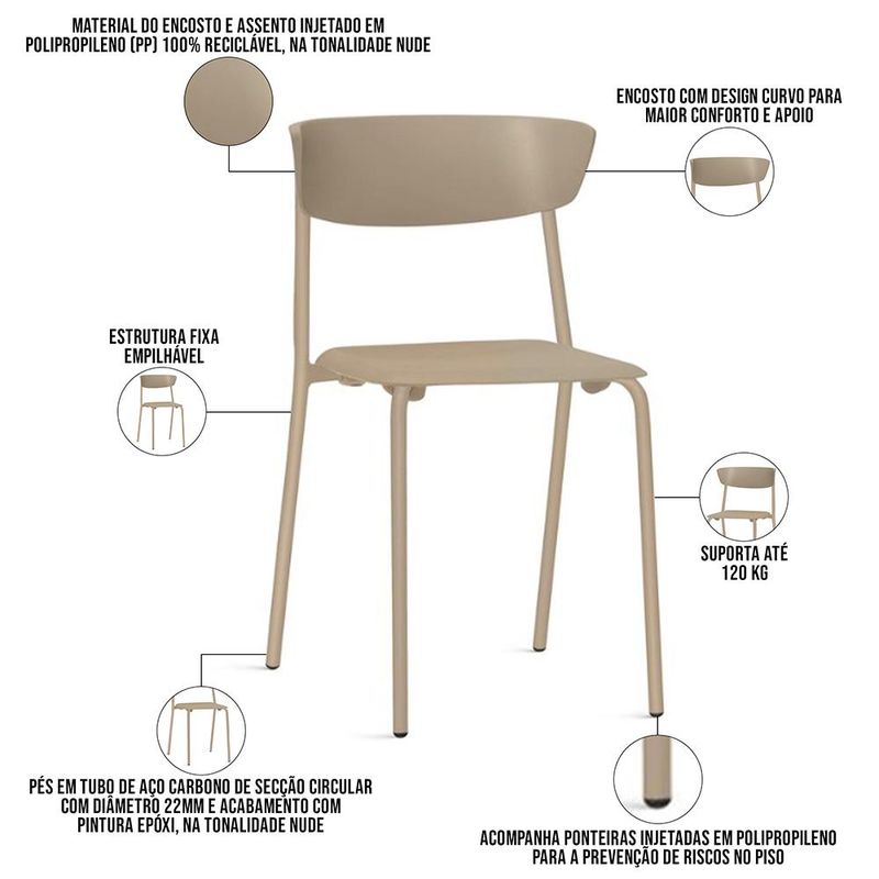Inove seus espaços com o Kit 02 Cadeiras Fixa Empilhável Atom, da Lyam Decor, a combinação perfeita de design contemporâneo e conforto acolhedor. Feita de polipropileno resistente e com uma base em tubo de aço carbono circular, essa cadeira empilhável é a escolha ideal para ambientes comerciais e corporativos, como escolas, escritórios, refeitórios, salões de eventos e lounge. Sua estética expressiva e irreverente encanta a todos, enquanto as formas envolventes e as superfícies côncavas proporcionam um aconchego inigualável, perfeito para momentos de interação e descontração. E o melhor: a Cadeira Atom é empilhável, garantindo uma organização prática e eficiente do seu espaço. Além disso, o design harmoniza modernidade e a elegância do estilo retrô, o que a torna uma declaração de estilo. Dê um toque de beleza e funcionalidade ao seu ambiente, escolha a Atom e deixe sua marca! Dimensões da Cadeira (L x A x P) 43 x 80 x 48 cm Medidas Internas: Altura do chão ao assento: 48,5 cm Encosto (L x A): 47,5 x 17 cm Interna entre os pés (L x P): 41 cm x 41 cm Características: Material do encosto e assento injetado em Polipropileno (PP) 100% reciclável, na tonalidade Nude. Pés em tubo de aço carbono de secção circular, com diâmetro 22mm e acabamento com pintura epóxi, na tonalidade Nude. Encosto com design curvo para maior conforto e apoio. Acompanha ponteiras injetadas em polipropileno para a prevenção de riscos no piso. Peso máximo suportado 120 kg. Estrutura fixa empilhável. Produto 100% Nacional. - Nunca sentar nos braços ou encosto do produto. - Indicado para uso residencial, sua limpeza deve ser feita com pano levemente umedecido em água limpa, sem esfregar, não utilizar produtos abrasivos, desengordurantes, álcool ou solvente. Observações importantes: - Produto para uso residencial em ambiente interno, não devendo ficar exposto diretamente ao sol, calor e umidade excessivos. - Pode haver alguma diferença de tonalidade entre a imagem e o produto real, por conta do tratamento de imagens e a calibração de cores do seu monitor. - As imagens são meramente ilustrativas, não acompanham objetos de decoração e eletrônicos. - Ao receber a mercadoria, o cliente deve verificar as condições da embalagem, caso haja alguma avaria não assine o comprovante de recebimento e entre em contato com nossa loja para orientações. - Montagem, desmontagem e outras instalações serão de responsabilidade do cliente. Não nos responsabilizamos, no ato da entrega, por subir escadas/elevadores ou pelo transporte por guincho em apartamentos. Eventuais despesas são de responsabilidade do comprador. - Confira as dimensões do produto e certifique-se de que passará normalmente por supostos elevadores, portas, escadas e/ou corredores de sua residência. - Para mais informações, acesse nossa Central de Atendimento.