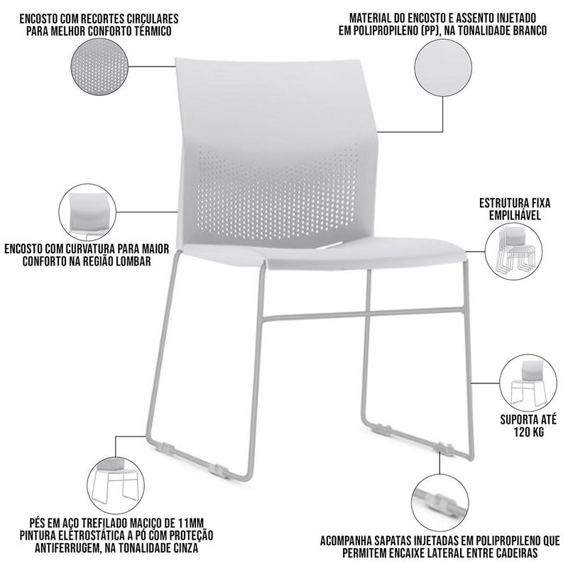 Descubra o Kit 02 Cadeiras Fixa Empilhável Link, da Lyam Decor, a solução perfeita para quem busca funcionalidade e elegância em um só produto! Feita em polipropileno de alta qualidade e com uma robusta base em aço trefilado, essa cadeira empilhável é ideal para transformar qualquer espaço comercial ou corporativo. Seja em escolas, escritórios, refeitórios, salões de eventos ou aonde mais você precisar, a Cadeira Link se adapta com facilidade e charme. Sua estrutura leve e empilhável facilita o armazenamento, enquanto as sapatas conectoras permitem unir várias unidades, proporcionando uma organização impecável e eficiente. Crie ambientes flexíveis e dinâmicos, prontos para receber todos os tipos de eventos e reuniões com estilo e conforto. Experimente a Cadeira Link e leve inovação ao seu espaço! Dimensões da Cadeira (L x A x P) 55,5 x 82 x 55 cm Medidas Internas: Altura do chão ao assento: 44,5 cm Encosto (L x A): 46,2 x 44,5 cm Profundidade dos pés: 52 cm Largura interna entre os pés: 44,5 cm Profundidade interna entre os pés: 48 cm Características: Material do encosto e assento injetado em Polipropileno (PP), na tonalidade Branco. Pés em aço trefilado maciço de 11mm com pintura eletrostática a pó com proteção antiferrugem, na tonalidade Cinza. Encosto com recortes circulares para melhor conforto térmico. Encosto com curvatura para maior conforto na região lombar. Acompanha sapatas injetadas em polipropileno que permitem encaixe lateral entre Cadeiras Fixa, possibilitando o alinhamento e organização em espaços coletivos, e prevenção de riscos no piso quando em contato com a superfície Peso máximo suportado 120 kg. Estrutura fixa empilhável. Produto 100% Nacional. - Nunca sentar nos braços ou encosto do produto. - Indicado para uso residencial, sua limpeza deve ser feita com pano levemente umedecido em água limpa, sem esfregar, não utilizar produtos abrasivos, desengordurantes, álcool ou solvente. Observações importantes: - Produto para uso residencial em ambiente interno, não devendo ficar exposto diretamente ao sol, calor e umidade excessivos. - Pode haver alguma diferença de tonalidade entre a imagem e o produto real, por conta do tratamento de imagens e a calibração de cores do seu monitor. - As imagens são meramente ilustrativas, não acompanham objetos de decoração e eletrônicos. - Ao receber a mercadoria, o cliente deve verificar as condições da embalagem, caso haja alguma avaria não assine o comprovante de recebimento e entre em contato com nossa loja para orientações. - Montagem, desmontagem e outras instalações serão de responsabilidade do cliente. Não nos responsabilizamos, no ato da entrega, por subir escadas/elevadores ou pelo transporte por guincho em apartamentos. Eventuais despesas são de responsabilidade do comprador. - Confira as dimensões do produto e certifique-se de que passará normalmente por supostos elevadores, portas, escadas e/ou corredores de sua residência. - Para mais informações, acesse nossa Central de Atendimento.