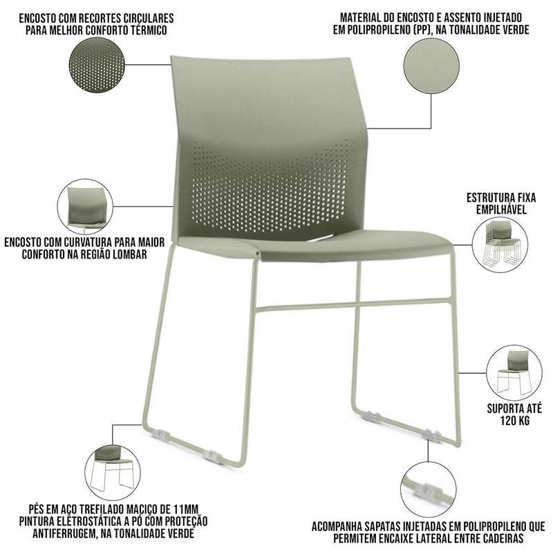 Descubra o Kit 02 Cadeiras Fixa Empilhável Link, da Lyam Decor, a solução perfeita para quem busca funcionalidade e elegância em um só produto! Feita em polipropileno de alta qualidade e com uma robusta base em aço trefilado, essa cadeira empilhável é ideal para transformar qualquer espaço comercial ou corporativo. Seja em escolas, escritórios, refeitórios, salões de eventos ou aonde mais você precisar, a Cadeira Link se adapta com facilidade e charme. Sua estrutura leve e empilhável facilita o armazenamento, enquanto as sapatas conectoras permitem unir várias unidades, proporcionando uma organização impecável e eficiente. Crie ambientes flexíveis e dinâmicos, prontos para receber todos os tipos de eventos e reuniões com estilo e conforto. Experimente a Cadeira Link e leve inovação ao seu espaço! Dimensões da Cadeira (L x A x P) 55,5 x 82 x 55 cm Medidas Internas: Altura do chão ao assento: 44,5 cm Encosto (L x A): 46,2 x 44,5 cm Profundidade dos pés: 52 cm Largura interna entre os pés: 44,5 cm Profundidade interna entre os pés: 48 cm Características: Material do encosto e assento injetado em Polipropileno (PP), na tonalidade Verde. Pés em aço trefilado maciço de 11mm com pintura eletrostática a pó com proteção antiferrugem, na tonalidade Verde. Encosto com recortes circulares para melhor conforto térmico. Encosto com curvatura para maior conforto na região lombar. Acompanha sapatas injetadas em polipropileno que permitem encaixe lateral entre Cadeiras Fixa, possibilitando o alinhamento e organização em espaços coletivos, e prevenção de riscos no piso quando em contato com a superfície Peso máximo suportado 120 kg. Estrutura fixa empilhável. Produto 100% Nacional. - Nunca sentar nos braços ou encosto do produto. - Indicado para uso residencial, sua limpeza deve ser feita com pano levemente umedecido em água limpa, sem esfregar, não utilizar produtos abrasivos, desengordurantes, álcool ou solvente. Observações importantes: - Produto para uso residencial em ambiente interno, não devendo ficar exposto diretamente ao sol, calor e umidade excessivos. - Pode haver alguma diferença de tonalidade entre a imagem e o produto real, por conta do tratamento de imagens e a calibração de cores do seu monitor. - As imagens são meramente ilustrativas, não acompanham objetos de decoração e eletrônicos. - Ao receber a mercadoria, o cliente deve verificar as condições da embalagem, caso haja alguma avaria não assine o comprovante de recebimento e entre em contato com nossa loja para orientações. - Montagem, desmontagem e outras instalações serão de responsabilidade do cliente. Não nos responsabilizamos, no ato da entrega, por subir escadas/elevadores ou pelo transporte por guincho em apartamentos. Eventuais despesas são de responsabilidade do comprador. - Confira as dimensões do produto e certifique-se de que passará normalmente por supostos elevadores, portas, escadas e/ou corredores de sua residência. - Para mais informações, acesse nossa Central de Atendimento.