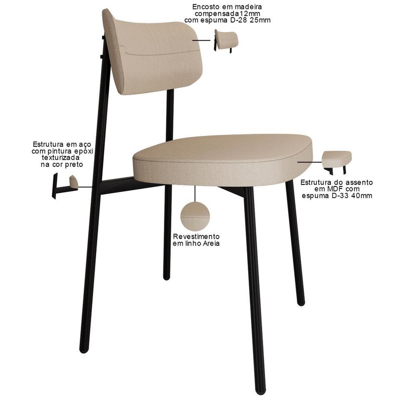 Transforme sua sala de jantar com a nossa Cadeira Astrid! Desfrute de momentos inesquecíveis ao redor da mesa com a cadeira Astrid, projetada para oferecer o máximo de conforto e elegância na sua sala de jantar ou cozinha. Com encosto curvo, ofertando maior conforto no uso, e assento estofado com uma espuma de altíssima qualidade, ela proporciona suporte ideal para longas refeições e conversas agradáveis. Além de combinar durabilidade e estilo, ela é a escolha perfeita para quem busca sofisticação e bem-estar em cada detalhe. Aproveite! Dimensões da Cadeira (L x A x P) 44,2 x 83,8 x 44,7 cm Altura do chão ao assento: 48,2 cm Largura do encosto: 50 cm Altura do encosto: 21 cm Características: Estrutura fixa em aço carbono com pintura epóxi na cor preto. Encosto produzido em madeira compensada com espuma D-28, 25mm. Assento produzido em MDF com espuma D-33, 40mm. Revestimento em Linho Areia. Peso suportado de até 120 kg. Produto entregue desmontado, acompanha manual de montagem. - Por se tratar de estofado as medidas podem ter uma pequena variação de até 3 cm. - A tonalidade do produto real poderá ter ligeira variação devido o lote de tecidos. - A limpeza deve ser feita com pano levemente umedecido em água limpa, sem esfregar, não utilizar produtos abrasivos, desengordurantes, álcool ou solvente. Observações importantes: - Produto para uso residencial em ambiente interno, não devendo ficar exposto diretamente ao sol, calor e umidade excessivos. - Pode haver alguma diferença de tonalidade entre a imagem e o produto real, por conta do tratamento de imagens e a calibração de cores do seu monitor. - As imagens são meramente ilustrativas, não acompanham objetos de decoração e eletrônicos. - Ao receber a mercadoria, o cliente deve verificar as condições da embalagem, caso haja alguma avaria não assine o comprovante de recebimento. - Montagem, desmontagem e outras instalações serão de responsabilidade do cliente. Não nos responsabilizamos, no ato da entrega, por subir escadas/elevadores ou pelo transporte por guincho em apartamentos. Eventuais despesas são de responsabilidade do comprador. - Confira as dimensões do produto e certifique-se de que passará normalmente por supostos elevadores, portas, escadas e/ou corredores de sua residência.