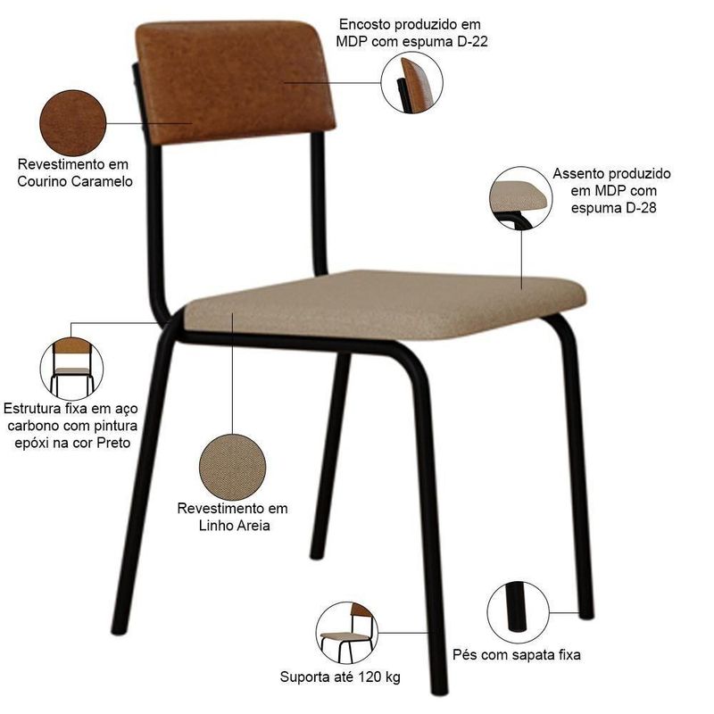 Kit 02 Cadeiras Estofada Para Sala De Jantar Sense Preto C01 Linho Areia Courino Caramelo - Lyam DecorDesfrute de momentos inesquecíveis com a Cadeira Sense, projetada para oferecer o máximo de conforto e elegância com seu design slim. Com sua estrutura de aço, assento e encosto estofados com materiais de altíssima qualidade, ela proporciona suporte ideal para longas refeições e conversas agradáveis. Além de combinar durabilidade e estilo, ela é a escolha perfeita para quem busca sofisticação e bem-estar em cada detalhe. Transforme sua sala de jantar com a nossa Cadeira Sense. Garanta já a sua!Dimensões da Cadeira (L x A x P) 47,5 x 81 x 50,5 cmAltura do chão ao assento: 47,5 cm Largura do encosto: 41 cm Altura do encosto: 17 cm Profundidade do assento: 40 cmCaracterísticas: Estrutura fixa em aço carbono com pintura epóxi na cor preto. Encosto produzido em MDP com espuma D-22. Assento produzido em MDP com espuma D-28. Revestimento em Linho Areia Courino Caramelo. Pés com sapatas fixa. Peso suportado de até 120 kg.- Por se tratar de estofado as medidas podem ter uma pequena variação de até 3 cm. - A tonalidade do produto real poderá ter ligeira variação devido o lote de tecidos. - A limpeza deve ser feita com pano levemente umedecido em água limpa, sem esfregar, não utilizar produtos abrasivos, desengordurantes, álcool ou solvente.Observações importantes: - Produto para uso residencial em ambiente interno, não devendo ficar exposto diretamente ao sol, calor e umidade excessivos. - Pode haver alguma diferença de tonalidade entre a imagem e o produto real, por conta do tratamento de imagens e a calibração de cores do seu monitor. - As imagens são meramente ilustrativas, não acompanham objetos de decoração e eletrônicos. - Ao receber a mercadoria, o cliente deve verificar as condições da embalagem, caso haja alguma avaria não assine o comprovante de recebimento. - Montagem, desmontagem e outras instalações serão de responsabilidade do cliente. Não nos responsabilizamos, no ato da entrega, por subir escadas/elevadores ou pelo transporte por guincho em apartamentos. Eventuais despesas são de responsabilidade do comprador. - Confira as dimensões do produto e certifique-se de que passará normalmente por supostos elevadores, portas, escadas e/ou corredores de sua residência. ColorFamily: Caramelo | Cor: Caramelo | Fabricante: Lyam Decor | ProductWeight: 11,5 kg | É empilhável: Não | Tempo de montagem: na | Cor do estofamento: AreiaCaramelo | OriginState: PR | ProductLength: 51 cm | SizeDescription: Altura: 162 cm x Largura: 48 cm x Profundidade: 51 cm | ProductWarranty: 90 dias após o recebimento do produto | Cor do assento: Areia | Material do estofamento: Aço, MDP, Linho e Couro sintético | É dobrável: Não | Firmeza: Firme | SupplierSimpleName: Kit 02 Cadeiras Estofada Para Sala de Jantar Sense Preto C01 Linho Areia Courino Caramelo - Lyam Dec | ProductContents: 02 Cadeiras | É cadeira de balanço: Não | Profundidade do assento: 40 cm | Model: Sense | Desenho do tecido: Liso | Largura da cadeira: 47,5 cm | Profundidade da cadeira: 51 cm | Requer montagem: Não | ProductHeight: 162 cm | ColorSupplier: Caramelo | MaterialFamily: Aço, MDP, Linho e Couro sintético | OriginCountry: Brasil | ProductWidth: 48 cm | Altura da cadeira: 81 cm | Cor da estrutura da cadeira: Preto | Espessura do assento: na | Peso máximo suportado: 120 kg | Color: Caramelo | ColorSimple: Caramelo | Material: Estrutura em Aço e MDP, Revestimento em Linho e Couro sintético | ProductInstructions: Produto para uso em ambiente interno, nao devendo ficar exposto ao sol, calor e umidade excessivos. | Largura do assento: NA | Altura do assento a partir do solo: 47,5 cm