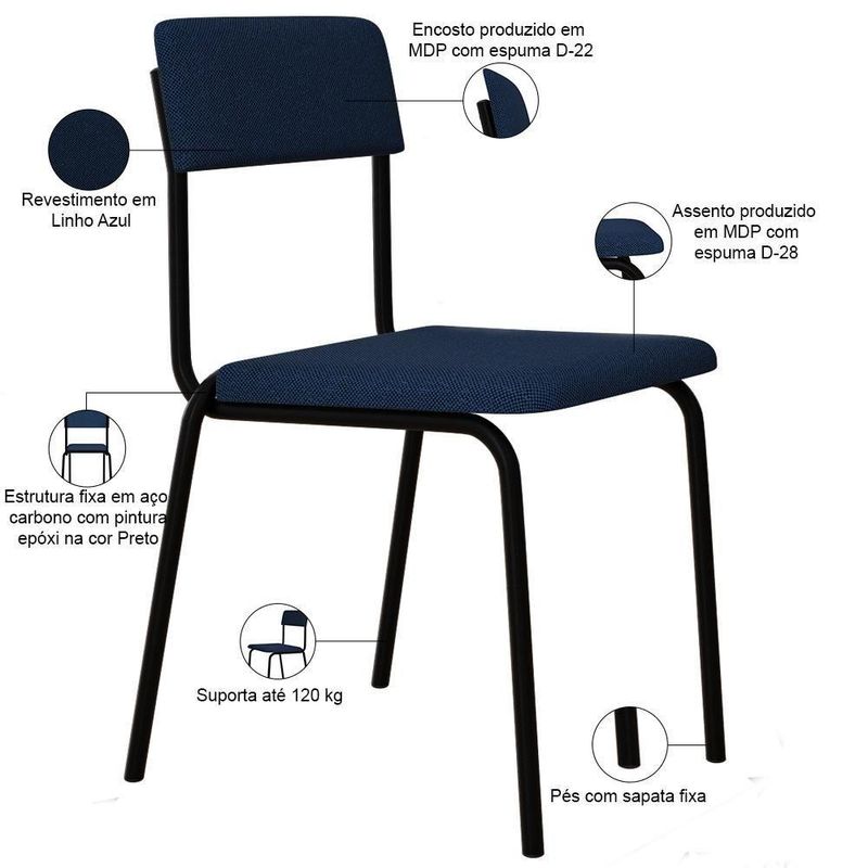 Kit 02 Cadeiras Estofada Para Sala De Jantar Sense Preto C01 Linho Azul - Lyam DecorDesfrute de momentos inesquecíveis com a Cadeira Sense, projetada para oferecer o máximo de conforto e elegância com seu design slim. Com sua estrutura de aço, assento e encosto estofados com materiais de altíssima qualidade, ela proporciona suporte ideal para longas refeições e conversas agradáveis. Além de combinar durabilidade e estilo, ela é a escolha perfeita para quem busca sofisticação e bem-estar em cada detalhe. Transforme sua sala de jantar com a nossa Cadeira Sense. Garanta já a sua!Dimensões da Cadeira (L x A x P) 47,5 x 81 x 50,5 cmAltura do chão ao assento: 47,5 cm Largura do encosto: 41 cm Altura do encosto: 17 cm Profundidade do assento: 40 cmCaracterísticas: Estrutura fixa em aço carbono com pintura epóxi na cor preto. Encosto produzido em MDP com espuma D-22. Assento produzido em MDP com espuma D-28. Revestimento em Linho Azul. Pés com sapatas fixa. Peso suportado de até 120 kg.- Por se tratar de estofado as medidas podem ter uma pequena variação de até 3 cm. - A tonalidade do produto real poderá ter ligeira variação devido o lote de tecidos. - A limpeza deve ser feita com pano levemente umedecido em água limpa, sem esfregar, não utilizar produtos abrasivos, desengordurantes, álcool ou solvente.Observações importantes: - Produto para uso residencial em ambiente interno, não devendo ficar exposto diretamente ao sol, calor e umidade excessivos. - Pode haver alguma diferença de tonalidade entre a imagem e o produto real, por conta do tratamento de imagens e a calibração de cores do seu monitor. - As imagens são meramente ilustrativas, não acompanham objetos de decoração e eletrônicos. - Ao receber a mercadoria, o cliente deve verificar as condições da embalagem, caso haja alguma avaria não assine o comprovante de recebimento. - Montagem, desmontagem e outras instalações serão de responsabilidade do cliente. Não nos responsabilizamos, no ato da entrega, por subir escadas/elevadores ou pelo transporte por guincho em apartamentos. Eventuais despesas são de responsabilidade do comprador. - Confira as dimensões do produto e certifique-se de que passará normalmente por supostos elevadores, portas, escadas e/ou corredores de sua residência. ColorFamily: Azul | ColorSupplier: Azul | OriginCountry: Brasil | ProductWidth: 48 cm | ProductWeight: 11,5 kg | É cadeira de balanço: Não | Espessura do assento: na | Tempo de montagem: na | Firmeza: Firme | Requer montagem: Não | Fabricante: Lyam Decor | Cor da estrutura da cadeira: Preto | É empilhável: Não | Profundidade da cadeira: 51 cm | Altura do assento a partir do solo: 47,5 cm | ProductContents: 02 Cadeiras | Altura da cadeira: 81 cm | Peso máximo suportado: 120 kg | Profundidade do assento: 40 cm | Color: Azul | Cor do estofamento: Azul | ColorSimple: Azul | Material: Estrutura em Aço e MDP, Revestimento em Linho | ProductLength: 51 cm | Model: Sense | SizeDescription: Altura: 162 cm x Largura: 48 cm x Profundidade: 51 cm | OriginState: PR | ProductInstructions: Produto para uso em ambiente interno, nao devendo ficar exposto ao sol, calor e umidade excessivos. | Desenho do tecido: Liso | ProductWarranty: 90 dias após o recebimento do produto | Material do estofamento: Aço, MDP e Linho | Cor do assento: Azul | Largura do assento: NA | Largura da cadeira: 47,5 cm | É dobrável: Não | ProductHeight: 162 cm | Cor: Azul | SupplierSimpleName: Kit 02 Cadeiras Estofada Para Sala de Jantar Sense Preto C01 Linho Azul - Lyam Decor | MaterialFamily: Aço, MDP e Linho