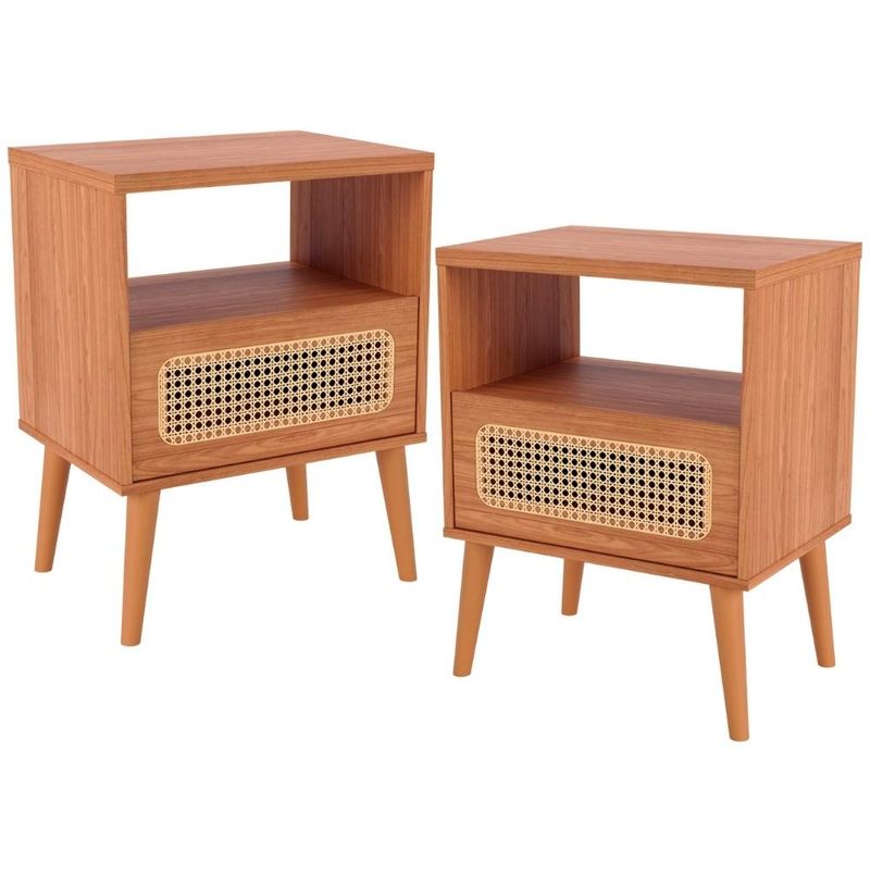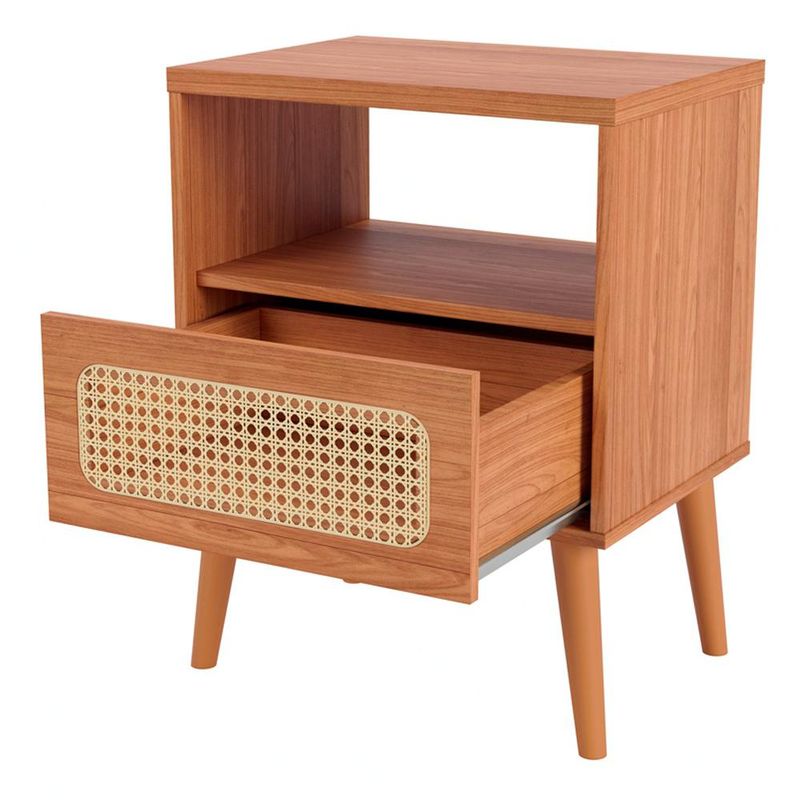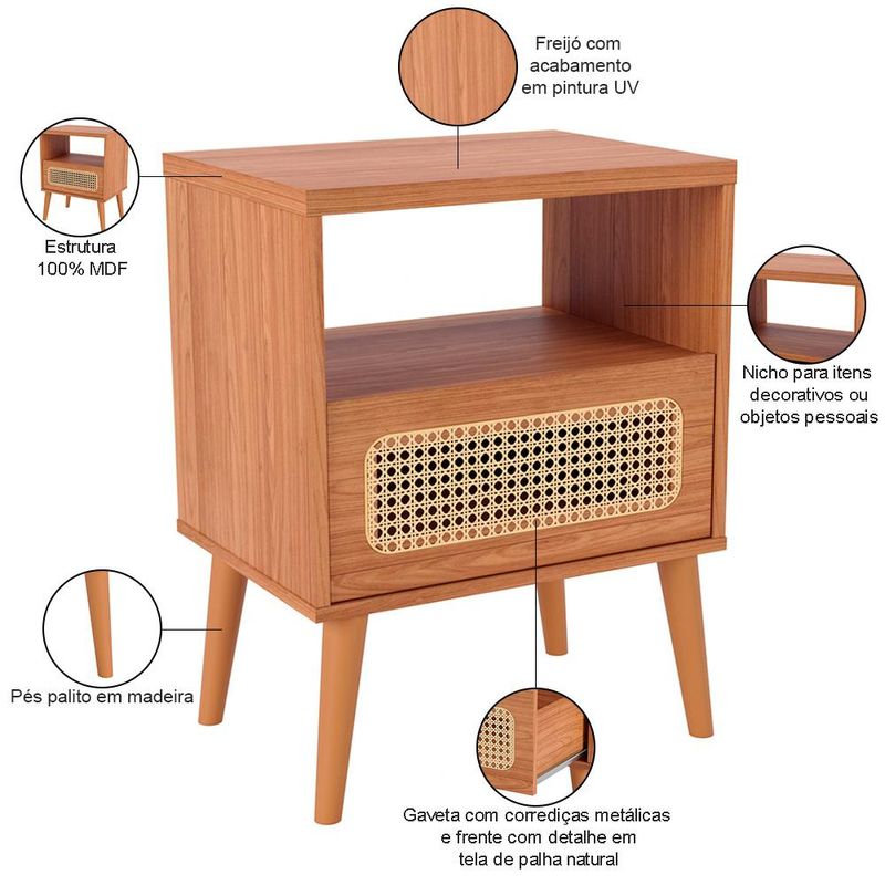 Conheça o elegante Kit 02 Mesas de Cabeceira Zack, da Lyam Decor, a solução perfeita para quem valoriza a harmonia entre estilo e praticidade no quarto. Com um design clássico e aconchegante, essa mesa de apoio é adornada com uma charmosa gaveta que exibe um detalhe de telinha em palha natural, trazendo um toque de natureza para o ambiente. Já os pés palito, com sua delicadeza, elevam a peça, proporcionando leveza e modernidade. Para completar, o design inteligente inclui um nicho aberto, ideal para livros, ou objetos pessoais, mantendo tudo à mão e organizado. Seja para enxergar sua rotina com mais organização ou simplesmente para embelezar seu espaço, a mesa de cabeceira Zack é um convite à versatilidade e ao conforto. Transforme o seu quarto em um verdadeiro refúgio de estilo e funcionalidade com a Mesa de Cabeceira Zack! Você vai se surpreender! Dimensões total do produto (L x A x P) 50 x 65 x 37 cm Medidas Internas Nicho (L x A): 46 x 48 cm Características: Estrutura em 100% MDF 15mm, tampo 25mm. Peça na tonalidade Freijó com acabamento em pintura UV. 01 gaveta com corrediças metálicas e frente com detalhe em tela de palha natural. Pés palito em madeira. 01 nicho para itens decorativos. Suporta até 10 kg distribuídos cada, conforme manual. - Produto entregue desmontado, acompanha manual de montagem. - Este produto deve ser limpo com pano macio e seco. Não utilize produtos abrasivos como álcool e detergente, assim como esponjas rígidas ou palha de aço. - Proteja a superfície do móvel de objetos que transmitam calor ou umidade. Observações importantes: - Produto para uso residencial em ambiente interno, não devendo ficar exposto diretamente ao sol, calor e umidade excessivos. - Pode haver alguma diferença de tonalidade entre a imagem e o produto real, por conta do tratamento de imagens e a calibração de cores do seu monitor. - As imagens são meramente ilustrativas, não acompanham objetos de decoração e eletrônicos. - Ao receber a mercadoria, o cliente deve verificar as condições da embalagem, caso haja alguma avaria não assine o comprovante de recebimento. - Montagem, desmontagem e outras instalações serão de responsabilidade do cliente. Não nos responsabilizamos, no ato da entrega, por subir escadas/elevadores ou pelo transporte por guincho em apartamentos. Eventuais despesas são de responsabilidade do comprador. - Confira as dimensões do produto e certifique-se de que passará normalmente por supostos elevadores, portas, escadas e/ou corredores de sua residência.