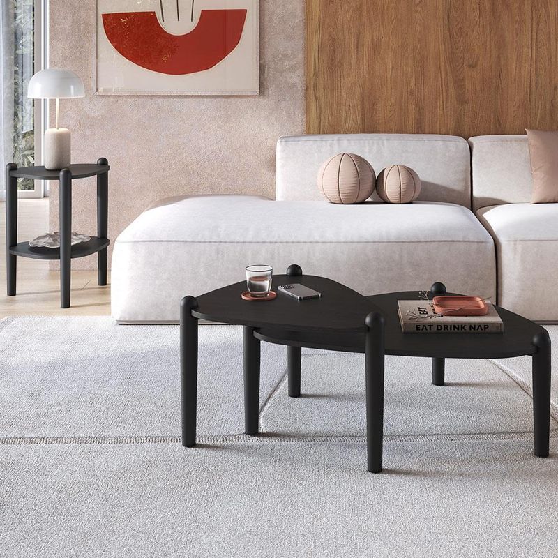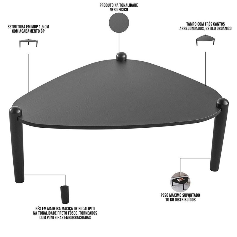 Atualize seu espaço com o Conjunto 02 Mesas de Centro e 01 Mesa Lateral Trium, da Lyam Decor, um kit que une funcionalidade e estética de forma encantadora. Com seu design estilo orgânico e cantos arredondados, tanto a mesa de apoio, quanto as mesas de centro não apenas complementam a decoração, mas adicionam um toque de elegância. Feita com pés torneados em madeira maciça de eucalipto, esse conjunto completo para sala de estar oferece estabilidade e um toque rústico que harmoniza com qualquer ambiente. Seu tampo generoso é perfeito para apoiar suas decorações favoritas, um livro que está em sua mesa de cabeceira ou até mesmo uma luminária que ilumina suas noites de leitura. Em outras palavras, a mesa lateral e as mesas de centro são ideais para adicionar praticidade sem abrir mão do estilo. Escolha Trium e adicione um toque de charme à sua casa, tornando cada momento mais especial e aconchegante. Dimensões da Mesa de Centro Baixa (L x A x P) 84,4 x 33 x 67,9 cm Dimensões da Mesa de Centro Alta (L x A x P) 55,4 x 41,3 x 59,3 cm Dimensões da Mesa Lateral (L x A x P) 44,6 x 58,4 x 41,8 cm Características das Mesas: Estrutura em MDP 15mm com acabamento BP. Produto na tonalidade Nero e pés na tonalidade Preto, ambos fosco. Pés em madeira maciça de Eucalipto torneados com ponteiras emborrachadas para evitar atrito do móvel com o piso. Tampos com três cantos arredondados, estilo orgânico. Peso máximo suportado 10 kg distribuídos em cada. - A limpeza deve ser feita com pano levemente umedecido em água limpa, sem esfregar, não utilizar produtos abrasivos, desengordurantes, álcool ou solvente. Observações importantes: - Produto para uso residencial em ambiente interno, não devendo ficar exposto diretamente ao sol, calor e umidade excessivos. - Pode haver alguma diferença de tonalidade entre a imagem e o produto real, por conta do tratamento de imagens e a calibração de cores do seu monitor. - As imagens são meramente ilustrativas, não acompanham objetos de decoração e eletrônicos. - Ao receber a mercadoria, o cliente deve verificar as condições da embalagem, caso haja alguma avaria não assine o comprovante de recebimento. - Montagem, desmontagem e outras instalações serão de responsabilidade do cliente. Não nos responsabilizamos, no ato da entrega, por subir escadas/elevadores ou pelo transporte por guincho em apartamentos. Eventuais despesas são de responsabilidade do comprador. - Confira as dimensões do produto e certifique-se de que passará normalmente por supostos elevadores, portas, escadas e/ou corredores de sua residência.