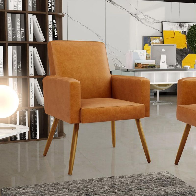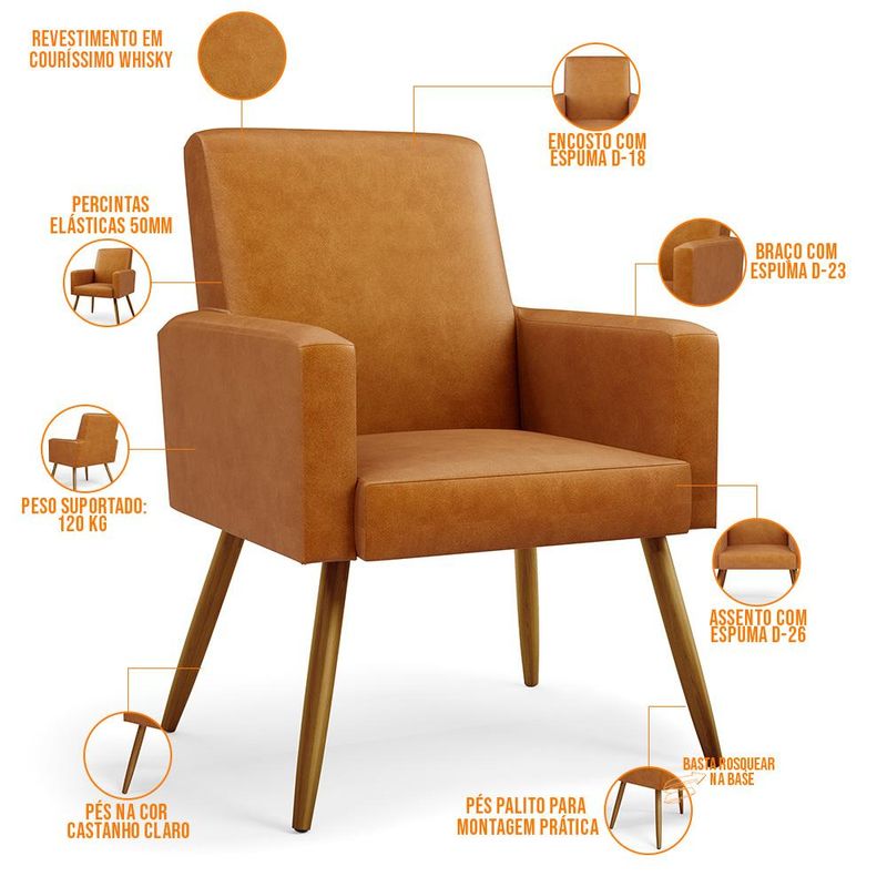 Não é novidade para ninguém que uma boa poltrona precisa ser bastante confortável, com materiais de qualidade e alta durabilidade. O Kit 02 Poltronas Decorativa Para Sala De Estar Maria W01 Pés Palito Couríssimo Whisky - Lyam Decor vem exatamente com essa proposta, sofisticado e versátil, com certeza irá valorizar ainda mais seu ambiente. As possibilidades para sua disposição são infinitas, seja para escritório, recepção, sala de espera ou estar, entre outras, seu conforto e beleza transformarão sua decoração por inteiro. Cabe mencionar também o revestimento em Couríssimo que contrasta perfeitamente com os pés palito na cor castanho, dando uma sutil delicadeza à peça. Garanta já a sua! Dimensões do produto (L x A x P) 61 x 84 x 59 cm Medidas Internas: Altura do encosto: 46 cm Altura do assento: 12 cm Largura do assento: 47 cm Profundidade do assento: 50 cm Altura do braço: 16 cm Largura do braço: 7 cm Altura do chão ao assento: 42 cm Altura dos pés: 30 cm Características: Estrutura em madeira de reflorestamento de eucalipto, pinus e MDF. Revestimento em Couríssimo na cor Whisky de alta qualidade, com acabamento semi brilho. Assento com espuma D-26. Encosto com espuma D-18. Braço com espuma D-23. Percinta elástica 50mm. Peso suportado de até 120kg. Pés Palito na cor Castanho Claro. - Por se tratar de estofado as medidas podem ter uma pequena variação de até 3 cm. - A tonalidade do produto real poderá ter ligeira variação devido o lote de tecidos. - A limpeza deve ser feita com pano umedecido em água limpa, sem esfregar, não utilizar produtos abrasivos, desengordurantes, álcool ou solvente. - Nunca sentar nos braços ou encosto do produto. Observações importantes: - Produto para uso residencial em ambiente interno, não devendo ficar exposto diretamente ao sol, calor e umidade excessivos. - Pode haver alguma diferença de tonalidade entre a imagem e o produto real, por conta do tratamento de imagens e a calibração de cores do seu monitor. - As imagens são meramente ilustrativas, não acompanham objetos de decoração e eletrônicos. - Ao receber a mercadoria, o cliente deve verificar as condições da embalagem, caso haja alguma avaria não assine o comprovante de recebimento. - Montagem, desmontagem e outras instalações serão de responsabilidade do cliente. Não nos responsabilizamos, no ato da entrega, por subir escadas/elevadores ou pelo transporte por guincho em apartamentos. Eventuais despesas são de responsabilidade do comprador. - Confira as dimensões do produto e certifique-se de que passará normalmente por supostos elevadores, portas, escadas e/ou corredores de sua residência.