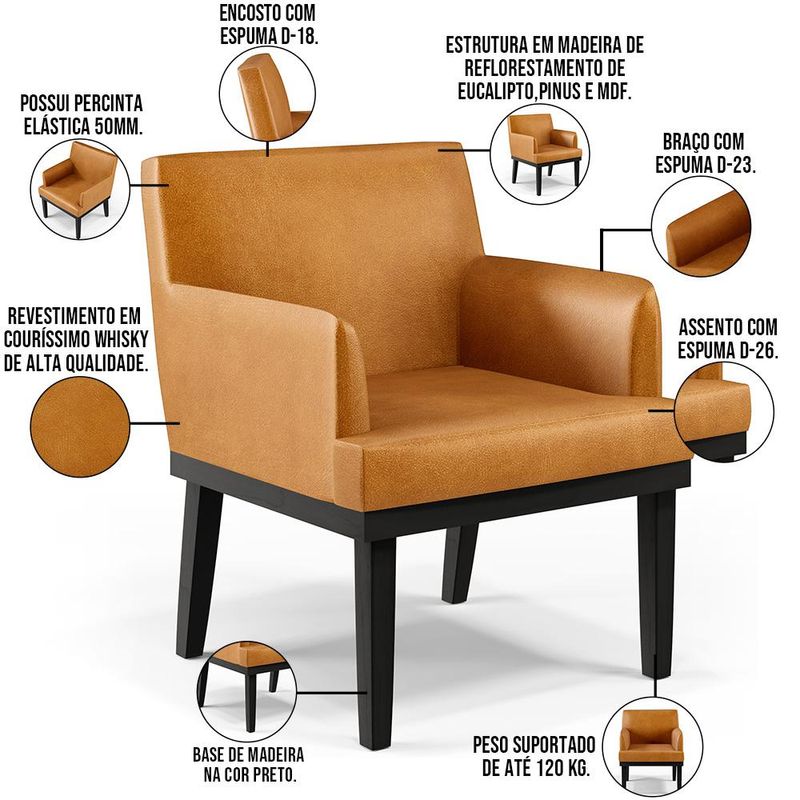 Não é novidade para ninguém que uma boa poltrona precisa ser bastante confortável, com materiais de qualidade e alta durabilidade. O Kit 02 Poltronas Decorativas Sala de Estar Base Preto Beatriz W01 Couríssimo Whisky - Lyam Decor vem exatamente com essa proposta, sofisticada e versátil, com certeza irá valorizar ainda mais seu ambiente. As possibilidades para sua disposição são infinitas, seja para escritório, recepção, sala de espera ou estar, entre outras, seu conforto e beleza transformarão sua decoração por inteiro. Cabe mencionar também o revestimento em Couríssimo, que contrastam perfeitamente com os pés na cor Preto dando uma sutil delicadeza à peça e garante o destaque que ela merece. Adquira já o seu! Dimensões do produto (L x A x P) 61 x 81 x 68 cm Medidas Internas: Altura do encosto: 42 cm Altura braço ao fim do encosto: 22 cm Largura do assento: 61 cm Largura interna do assento: 44 cm Profundidade do assento: 50 cm Largura interna da base: 60 cm Largura dos pés: 51,5 cm Características: Estrutura em madeira de reflorestamento de eucalipto, pinus e MDF. Revestimento em Couríssimo na cor Whisky, com acabamento semi brilho. Assento com espuma D-26. Encosto com espuma D-18. Braço com espuma D-23. Percinta elástica 50mm. Suporta até 120kg. Base de Madeira na cor Preto. - Por se tratar de estofado as medidas podem ter uma pequena variação de até 3 cm. - A tonalidade do produto real poderá ter ligeira variação devido o lote de tecidos. - A limpeza deve ser feita com pano levemente umedecido em água limpa, sem esfregar, não utilizar produtos abrasivos, desengordurantes, álcool ou solvente. - Nunca sentar nos braços ou encosto do produto. Observações importantes: - Produto para uso residencial em ambiente interno, não devendo ficar exposto diretamente ao sol, calor e umidade excessivos. - Pode haver alguma diferença de tonalidade entre a imagem e o produto real, por conta do tratamento de imagens e a calibração de cores do seu monitor. - As imagens são meramente ilustrativas, não acompanham objetos de decoração e eletrônicos. - Ao receber a mercadoria, o cliente deve verificar as condições da embalagem, caso haja alguma avaria não assine o comprovante de recebimento. - Montagem, desmontagem e outras instalações serão de responsabilidade do cliente. Não nos responsabilizamos, no ato da entrega, por subir escadas/elevadores ou pelo transporte por guincho em apartamentos. Eventuais despesas são de responsabilidade do comprador. - Confira as dimensões do produto e certifique-se de que passará normalmente por supostos elevadores, portas, escadas e/ou corredores de sua residência.