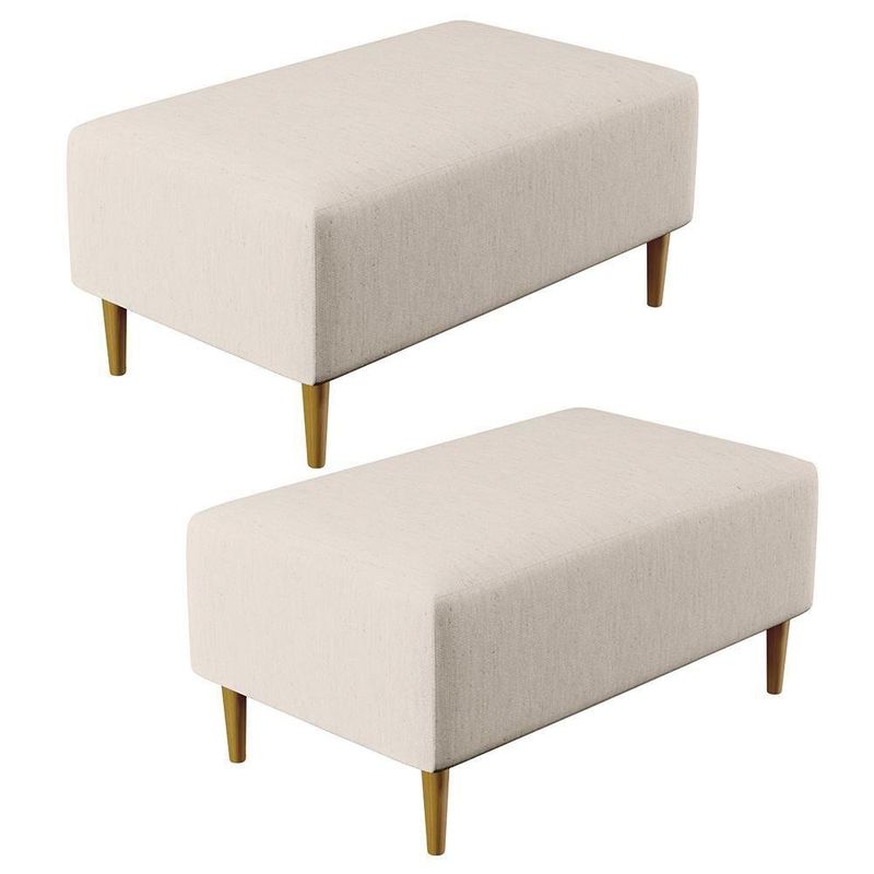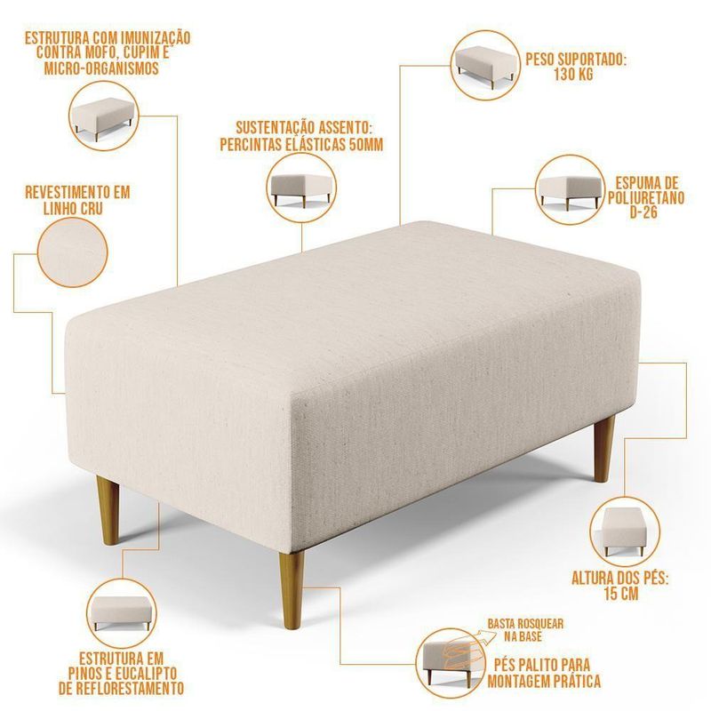 Kit 02 Puffs Decorativos Sala De Estar Cléo W01 Pés Palito 90 Cm Linho Cru - Lyam DecorPensando na praticidade do dia-dia, o Kit 02 Puffs Decorativos Sala de Estar Cléo W01 Pés Palito 90 cm Linho Cru - Lyam Decor se faz perfeito para a sua ambientação!! É extremamente confortável, ideal para quem procura por funcionalidade e beleza embutidos num único produto. Estruturado com espuma macia e de alta densidade e revestimento de excelente qualidade, além de seus belos pés palito que arrematam muito bem toda a composição deixando-o ainda mais elegante. Possuindo diferentes funções, pode ser posto em salas de estar, garantindo assentos extras, no quarto, como um apoio ou até mesmo recamier aos pés da cama, em closets, integrando ambientes, dentre outras maneiras. Com certeza vai harmonizar e embelezar ainda mais a decoração do seu lar.Características: Estrutura em pinus e eucalipto de reflorestamento, com imunização contra mofo, cupim e micro-organismos. Revestimento Linho Cru de alta qualidade. Espuma de poliuretano D-26. Pés Palito com prática, necessita apenas rosquear na base. Peso suportado: Até 110 kg. Sustentação do assento com percintas elásticas de 50mm.Dimensões do produto (L x A x P) 90 x 42 x 46 cmAltura dos pés: 15 cm.- Por se tratar de estofado as medidas podem ter uma pequena variação de até 3 cm. - A tonalidade do produto real poderá ter ligeira variação devido o lote de tecidos. Observações importantes: - Produto para uso residencial em ambiente interno, não devendo ficar exposto diretamente ao sol, calor e umidade excessivos. - Pode haver alguma diferença de tonalidade entre a imagem e o produto real, por conta do tratamento de imagens e a calibração de cores do seu monitor. - As imagens são meramente ilustrativas, não acompanham objetos de decoração e eletrônicos. - Ao receber a mercadoria, o cliente deve verificar as condições da embalagem, - Montagem, dese outras instalações serão de responsabilidade do cliente. Não nos responsabilizamos, no ato da , por subir escadas/elevadores ou pelo transporte por guincho em apartamentos. Eventuais despesas são de responsabilidade do comprador. - Confira as dimensões do produto e certifique-se de que passará normalmente por supostos elevadores, portas, escadas e/ou corredores de sua residência. NA