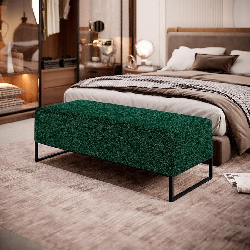 Pensando na praticidade do dia-dia, o Puff Decorativo Sala de Estar Bali W01 Base Ferro 120x50 cm Bouclê Verde - Lyam Decor se faz perfeito para a sua ambientação! É extremamente confortável, ideal para quem procura por funcionalidade e beleza embutidos num único produto. Estruturado com espuma macia e de alta densidade e revestimento de excelente qualidade, além de seus belos pés de metal que arrematam muito bem toda a composição deixando-o ainda mais elegante. Possuindo diferentes funções, pode ser posto em salas de estar, garantindo assentos extras, no quarto, como um apoio ou até mesmo recamier aos pés da cama, em closets, integrando ambientes, dentre outras maneiras. Com certeza irá embelezar ainda mais a decoração do seu lar, garanta já o seu!! Dimensões do produto (L x A x P) 120 x 45 x 50 cm Medidas Internas: Altura do assento: 27 cm Altura dos pés: 15 cm Características: Estrutura em pinus e eucalipto de reflorestamento, com imunização contra mofo, cupim e micro-organismos. Revestimento Bouclê na cor Verde de alta qualidade. Espuma de poliuretano D-18. Base de Ferro, com acabamento em pintura eletrostática na cor preto. Peso suportado: Até 110 kg. Sustentação do assento com percintas elásticas de 50mm. - Por se tratar de estofado as medidas podem ter uma pequena variação de até 3 cm. - A tonalidade do produto real poderá ter ligeira variação devido o lote de tecidos. Observações importantes: - Produto para uso residencial em ambiente interno, não devendo ficar exposto diretamente ao sol, calor e umidade excessivos. - Pode haver alguma diferença de tonalidade entre a imagem e o produto real, por conta do tratamento de imagens e a calibração de cores do seu monitor. - As imagens são meramente ilustrativas, não acompanham objetos de decoração e eletrônicos. - Ao receber a mercadoria, o cliente deve verificar as condições da embalagem, caso haja alguma avaria não assine o comprovante de recebimento. - Montagem, desmontagem e outras instalações serão de responsabilidade do cliente. Não nos responsabilizamos, no ato da entrega, por subir escadas/elevadores ou pelo transporte por guincho em apartamentos. Eventuais despesas são de responsabilidade do comprador. - Confira as dimensões do produto e certifique-se de que passará normalmente por supostos elevadores, portas, escadas e/ou corredores de sua residência.