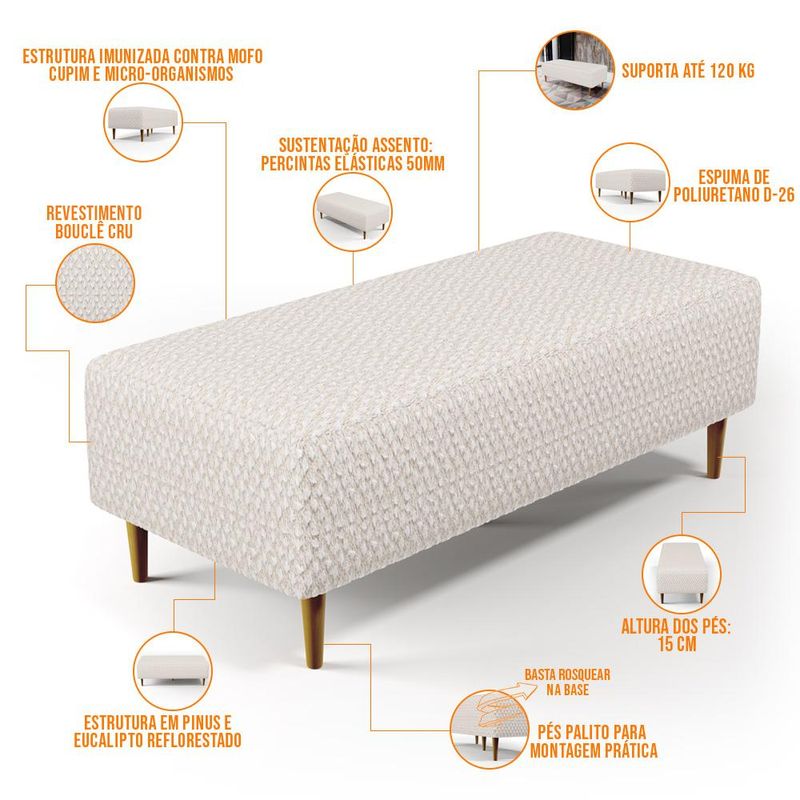 Pensando na praticidade do dia-dia, o Kit 02 Puffs Decorativos Sala de Estar Bali W01 Pés Palito 120x50 cm Bouclê Cru - Lyam se faz perfeito para a sua ambientação!! É extremamente confortável, ideal para quem procura por funcionalidade e beleza embutidos num único produto. Estruturado com espuma macia e de alta densidade e revestimento de excelente qualidade, além de seus belos pés palito que arrematam muito bem toda a composição deixando-o ainda mais elegante. Possuindo diferentes funções, pode ser posto em salas de estar, garantindo assentos extras, no quarto, como um apoio ou até mesmo recamier aos pés da cama, em closets, integrando ambientes, dentre outras maneiras. Com certeza vai harmonizar e embelezar ainda mais a decoração do seu lar. Dimensões do produto (L x A x P) 120 x 45 x 50 cm Características: Estrutura em pinus e eucalipto de reflorestamento, com imunização contra mofo, cupim e micro-organismos. Revestimento em Bouclê na cor Cru de alta qualidade. Espuma de poliuretano D-26. Pés Palito com montagem prática, necessita apenas rosquear na base. Peso suportado: Até 120 kg. Sustentação do assento com percintas elásticas de 50mm. Altura dos pés: 15cm - Por se tratar de estofado as medidas podem ter uma pequena variação de até 3 cm. - A tonalidade do produto real poderá ter ligeira variação devido o lote de tecidos. Observações importantes: - Produto para uso residencial em ambiente interno, não devendo ficar exposto diretamente ao sol, calor e umidade excessivos. - Pode haver alguma diferença de tonalidade entre a imagem e o produto real, por conta do tratamento de imagens e a calibração de cores do seu monitor. - As imagens são meramente ilustrativas, não acompanham objetos de decoração e eletrônicos. - Ao receber a mercadoria, o cliente deve verificar as condições da embalagem, caso haja alguma avaria não assine o comprovante de recebimento. - Montagem, desmontagem e outras instalações serão de responsabilidade do cliente. Não nos responsabilizamos, no ato da entrega, por subir escadas/elevadores ou pelo transporte por guincho em apartamentos. Eventuais despesas são de responsabilidade do comprador. - Confira as dimensões do produto e certifique-se de que passará normalmente por supostos elevadores, portas, escadas e/ou corredores de sua residência.