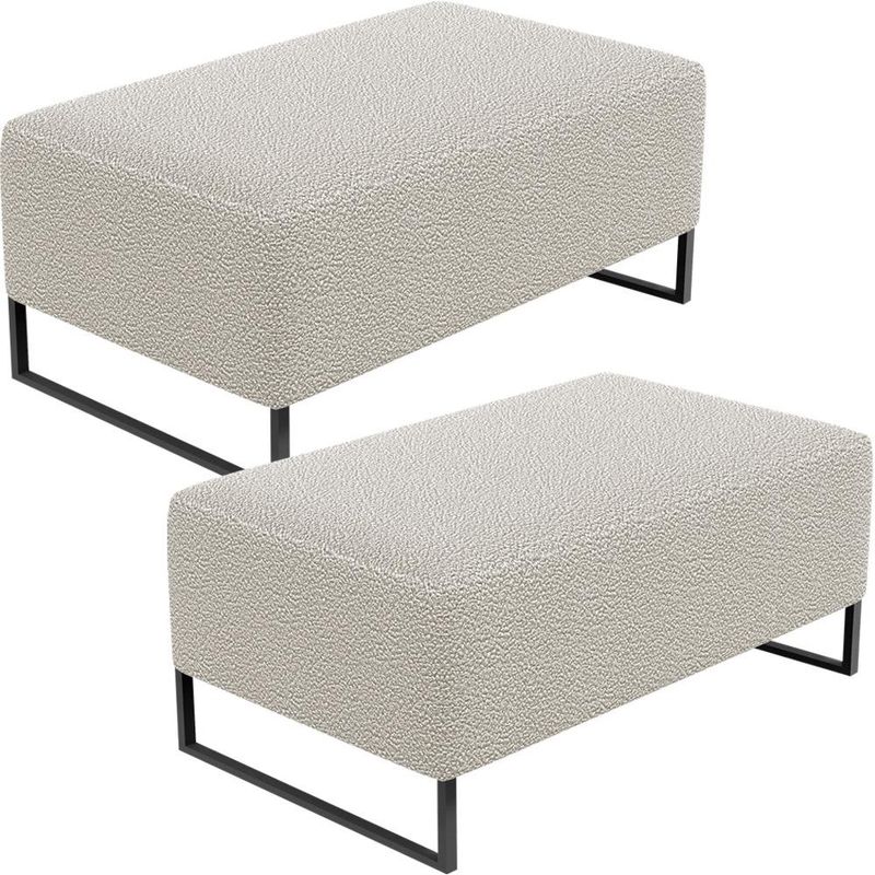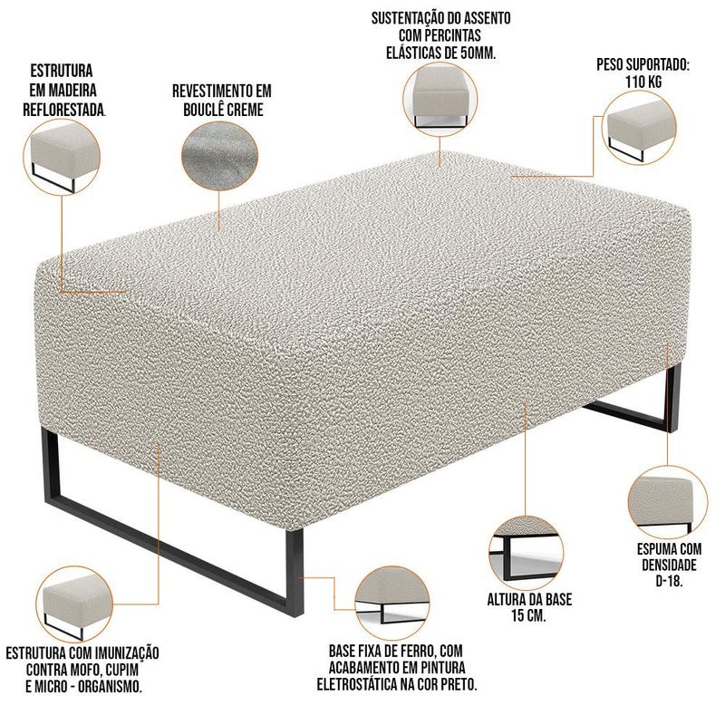 Pensando na praticidade do seu dia-dia, o Kit 02 Puffs Decorativo Sala De Estar Cléo 90cm W01 Base Ferro Preto Bouclê Creme - Lyam Decor se faz perfeito para a sua ambientação! É extremamente confortável, ideal para quem procura por Modernidade e beleza embutidos num único produto. Estruturado com espuma macia e de alta densidade e revestimento de excelente qualidade, além de seus belos pés de metal que arrematam muito bem toda a composição deixando-o ainda mais moderno. Possuindo diferentes funções, pode ser posto em salas de estar, garantindo assentos extras, no quarto, como um apoio ou até mesmo recamier aos pés da cama, em closets, integrando ambientes, dentre outras maneiras.Dimensões do produto (L x A x P) 90 x 42 x 46 cm Altura dos pés: 15 cm.Características: Estrutura em pinus e eucalipto de reflorestamento, com imunização contra mofo, cupim e micro-organismos. Revestimento em Bouclê na cor Creme. Espuma de poliuretano D-18. Base de Ferro, com acabamento em pintura eletrostática na cor Preto. Peso suportado: Até 110 kg. Sustentação do assento com percintas elásticas de 50mm.- Por se tratar de estofado as medidas podem ter uma pequena variação de até 3 cm.- A tonalidade do produto real poderá ter ligeira variação devido o lote de tecidos.- A limpeza deve ser feita com pano levemente umedecido em água limpa, sem esfregar, não utilizar produtos abrasivos, desengordurantes, álcool ou solvente. Observações importantes: - Produto para uso residencial em ambiente interno, não devendo ficar exposto diretamente ao sol, calor e umidade excessivos. - Pode haver alguma diferença de tonalidade entre a imagem e o produto real, por conta do tratamento de imagens e a calibração de cores do seu monitor. - Ao receber a mercadoria, o cliente deve verificar as condições da embalagem, caso haja alguma avaria não assine o comprovante de recebimento. - Montagem, desmontagem e outras instalações serão de responsabilidade do cliente. Não nos responsabilizamos, no ato da entrega, por subir escadas/elevadores ou pelo transporte por guincho em apartamentos. Eventuais despesas são de responsabilidade do comprador. - Confira as dimensões do produto e certifique-se de que passará normalmente por supostos elevadores, portas, escadas e/ou corredores de sua residência.