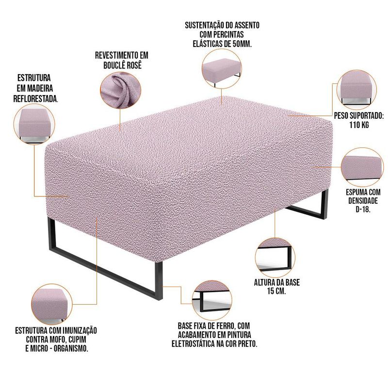 Pensando na praticidade do seu dia-dia, o Kit 02 Puffs Decorativo Sala De Estar Cléo 90cm W01 Base Ferro Preto Bouclê Rosê - Lyam Decor se faz perfeito para a sua ambientação! É extremamente confortável, ideal para quem procura por Modernidade e beleza embutidos num único produto. Estruturado com espuma macia e de alta densidade e revestimento de excelente qualidade, além de seus belos pés de metal que arrematam muito bem toda a composição deixando-o ainda mais moderno. Possuindo diferentes funções, pode ser posto em salas de estar, garantindo assentos extras, no quarto, como um apoio ou até mesmo recamier aos pés da cama, em closets, integrando ambientes, dentre outras maneiras. Com certeza irá embelezar ainda mais a decoração do seu lar, garanta já o seu!! Dimensões do produto (L x A x P) 90 x 42 x 46 cm Altura dos pés: 15 cm. Características: Estrutura em pinus e eucalipto de reflorestamento, com imunização contra mofo, cupim e micro-organismos. Revestimento em Bouclê na cor Rosê. Espuma de poliuretano D-18. Base de Ferro, com acabamento em pintura eletrostática na cor Preto. Peso suportado: Até 110 kg. Sustentação do assento com percintas elásticas de 50mm. - Por se tratar de estofado as medidas podem ter uma pequena variação de até 3 cm. - A tonalidade do produto real poderá ter ligeira variação devido o lote de tecidos. - A limpeza deve ser feita com pano levemente umedecido em água limpa, sem esfregar, não utilizar produtos abrasivos, desengordurantes, álcool ou solvente. Observações importantes: - Produto para uso residencial em ambiente interno, não devendo ficar exposto diretamente ao sol, calor e umidade excessivos. - Pode haver alguma diferença de tonalidade entre a imagem e o produto real, por conta do tratamento de imagens e a calibração de cores do seu monitor. - As imagens são meramente ilustrativas, não acompanham objetos de decoração e eletrônicos. - Ao receber a mercadoria, o cliente deve verificar as condições da embalagem, caso haja alguma avaria não assine o comprovante de recebimento. - Montagem, desmontagem e outras instalações serão de responsabilidade do cliente. Não nos responsabilizamos, no ato da entrega, por subir escadas/elevadores ou pelo transporte por guincho em apartamentos. Eventuais despesas são de responsabilidade do comprador. - Confira as dimensões do produto e certifique-se de que passará normalmente por supostos elevadores, portas, escadas e/ou corredores de sua residência.