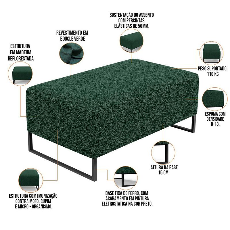 Pensando na praticidade do seu dia-dia, o Puff Decorativo Sala De Estar Cléo 90cm Base De Ferro Preto W01 Bouclê Verde - Lyam Decor se faz perfeito para a sua ambientação! É extremamente confortável, ideal para quem procura por Modernidade e beleza embutidos num único produto. Estruturado com espuma macia e de alta densidade e revestimento de excelente qualidade, além de seus belos pés de metal que arrematam muito bem toda a composição deixando-o ainda mais moderno. Possuindo diferentes funções, pode ser posto em salas de estar, garantindo assentos extras, no quarto, como um apoio ou até mesmo recamier aos pés da cama, em closets, integrando ambientes, dentre outras maneiras. Com certeza irá embelezar ainda mais a decoração do seu lar, garanta já o seu!! Características: Estrutura em pinus e eucalipto de reflorestamento, com imunização contra mofo, cupim e micro-organismos. Revestimento em Bouclê na cor Verde. Espuma de poliuretano D-18. Base de Ferro, com acabamento em pintura eletrostática na cor Preto. Peso suportado: Até 110 kg. Sustentação do assento com percintas elásticas de 50mm. Dimensões do produto (L x A x P) 90 x 42 x 46 cm Altura dos pés: 15 cm. - Por se tratar de estofado as medidas podem ter uma pequena variação de até 3 cm. - A tonalidade do produto real poderá ter ligeira variação devido o lote de tecidos. Observações importantes: - Produto para uso residencial em ambiente interno, não devendo ficar exposto diretamente ao sol, calor e umidade excessivos. - Pode haver alguma diferença de tonalidade entre a imagem e o produto real, por conta do tratamento de imagens e a calibração de cores do seu monitor. - As imagens são meramente ilustrativas, não acompanham objetos de decoração e eletrônicos. - Ao receber a mercadoria, o cliente deve verificar as condições da embalagem, caso haja alguma avaria não assine o comprovante de recebimento. - Montagem, desmontagem e outras instalações serão de responsabilidade do cliente. Não nos responsabilizamos, no ato da entrega, por subir escadas/elevadores ou pelo transporte por guincho em apartamentos. Eventuais despesas são de responsabilidade do comprador. - Confira as dimensões do produto e certifique-se de que passará normalmente por supostos elevadores, portas, escadas e/ou corredores de sua residência.